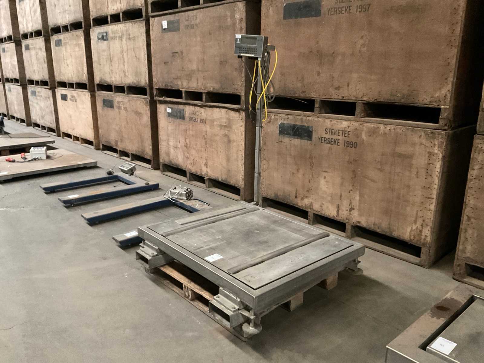 Elektrischer Palettenwagen mit integrierter Waage, batteriebetriebenem digitalen Elektronikpanel, maximale Lastkapazität 2000 kW, nie 0 Stunden genutzt Gesamtmaße: 1300 x 700 x 800 mm Gewicht: 150 kg Auktions-ID: A7-44803-351