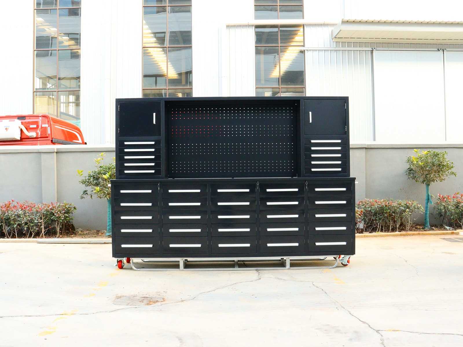 Metallwerkstattkabinett Maße: 2210 x 600 x 2050 mm Laden: 32 Schubladen Schubladenmaße: 450 x 480 x 120 mm Kapazität pro Schublade: 40 kg Verschluss: Schubladen abschließbar Türen: 4 Türen Abmessungen der Türen: 520 x 620 mm Griffe: Aluminiumgriffe Farbe: Schwarz Rahmen: Pulverbeschichteter Rahmen Vorderseiten: lackierte Vorderseiten Gewicht: 395 kg Zustand: Ungenutzt Auktions-ID: A3-43511-470