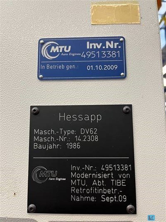 Drehdurchmesser: 1000 mmUmlaufdurchmesser: 1000 mm1. Technische DatenMaschinentyp: KarusselldrehmaschineHersteller: HessappTyp: DV 62Serien-Nr.: 14.2308Arbeitsbereich der SpindelGrößter Durchmesser 1000 mmGrößter Schwingdurchmesser 1000 mmKreuzschlittenwegeHub des Vertikalschlittens 900 mmHub des Horizontalschlittens 1810 mmGesamtverfahrweg 2315 mmDrehspindelSpindelkopf mit Zentrierkegel nach DIN 55021 A15Spindeldurchmesser im vorderen Lager 203mmHauptantriebÜber einen gesteuerten Asynchronmotor und Rädergetriebemit Bereichsumschaltung.SpindeldrehzahlenDrehzahlbereich I : 5 - 350 U/min.Drehzahlbereich II : 30 - 1000 U/min.VerfahrgeschwindigkeitX/Z-Achse : 10 m/min.W1-Achse : 8 U/min.Keine C-Achse