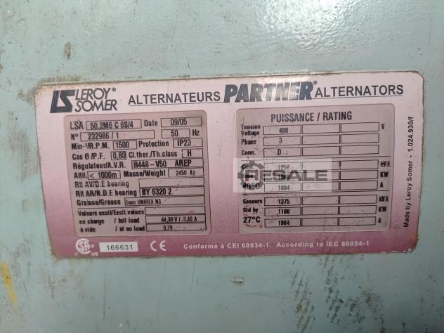 Piller AC-Generator NKT 1000-4 AC-Synchron-Generator von 1991 mit 9.300 Betriebsstunden, 1 verfügbar. 400 Volt/50 Hz, 875 KVA Hersteller: Piller Modell: NKT 1000-4 Typ: AC Synchrongenerator Seriennummer: M5B4022CA0198U Leistung [KVA]: 875 Spannung [V]: 400 Frequenz [Hz]: 50 Strom [A]: 1.263 Drehzahl [1/min]: 1.500 Baujahr: 1991 Abmessungen [m]: 2,05 x 1,30 x 1,85 Gewicht [kg]: 3.700