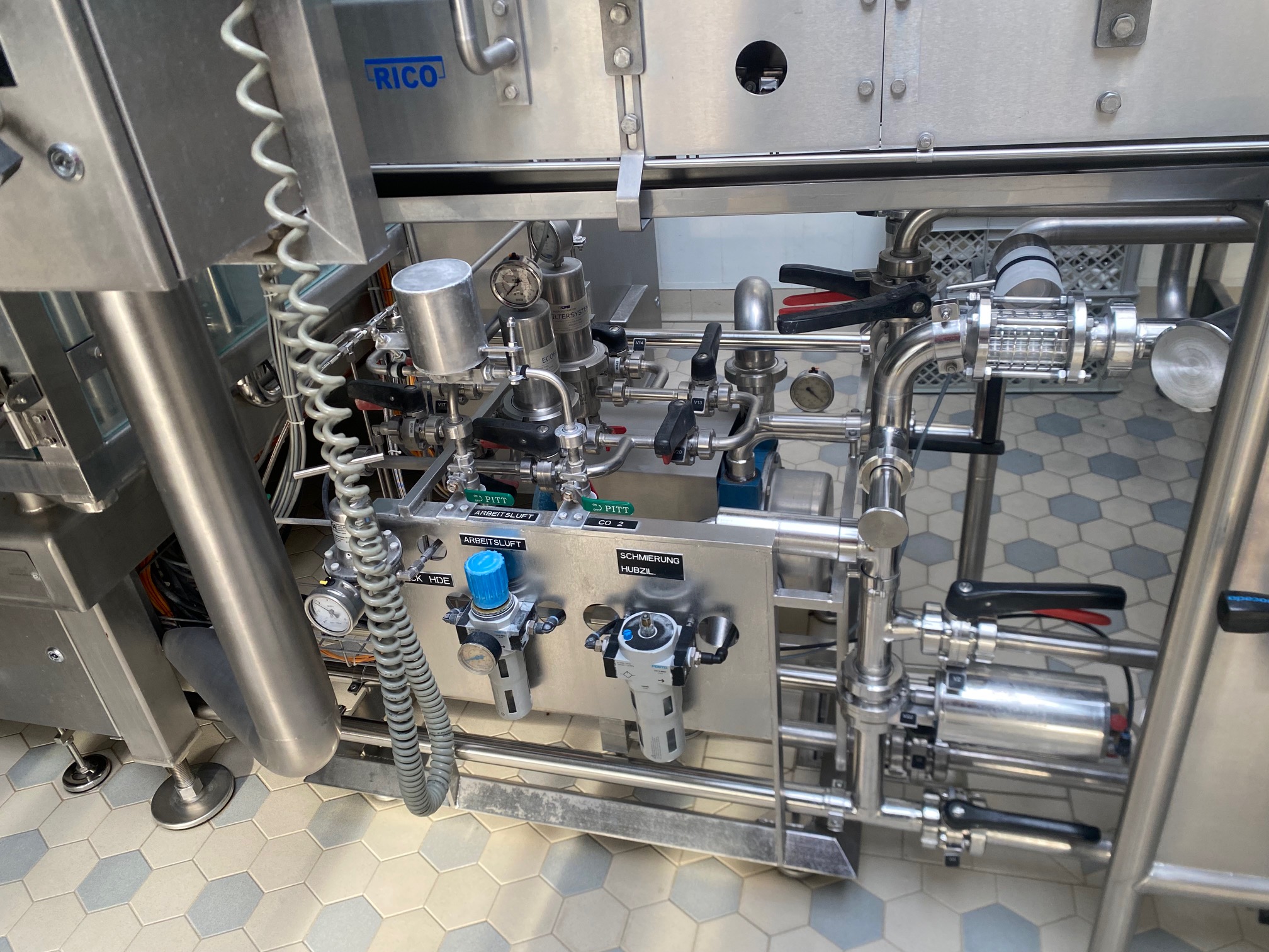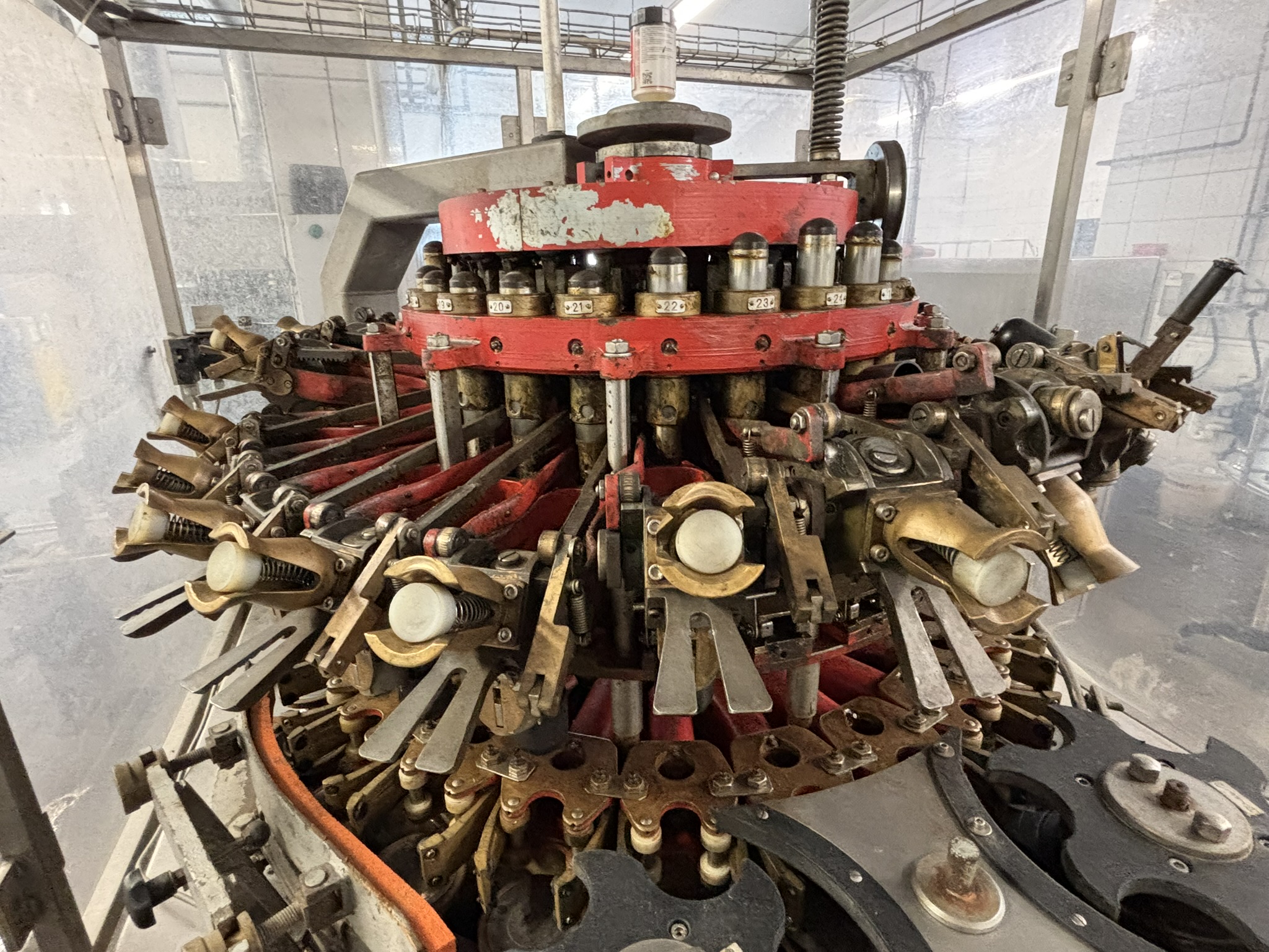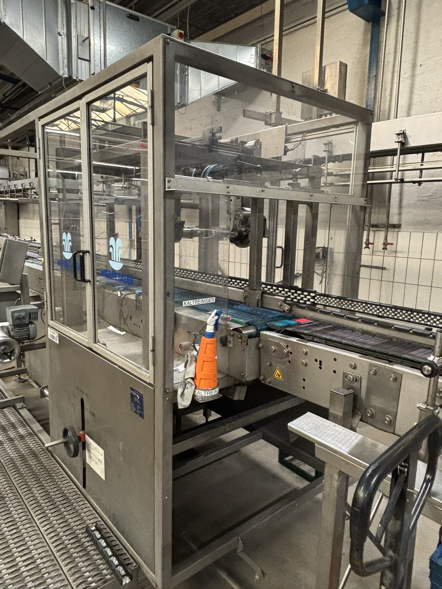 Übersicht Diese Kaltleim-Etikettiermaschine wurde im Jahr 2004 von der deutschen Firma KHS hergestellt. Die Maschine war bis Januar 2025 in Betrieb und ist nun im Unternehmen eingelagert. Die Etikettiermaschine verfügt über ein Kamerasystem zur Ausrichtung der Siegeletiketten für Bügelflaschen. Technische Daten Leistung: Bis zu 26.000 Flaschen pro Stunde Arbeitsrichtung: Gegen den Uhrzeigersinn Formate: 330 ml Longneck-Glasflaschen 330 ml Steinie-Glasflaschen 330 ml Bügel-Glasflaschen 500 ml NRW-Glasflaschen Positionen der Etiketten: Vorderseite (bis zu 2 Etiketten) Rückseite (bis zu 1 Etikett) Mit einer Siemens S7-Steuerung Neues HMI-Touchpanel in 2019