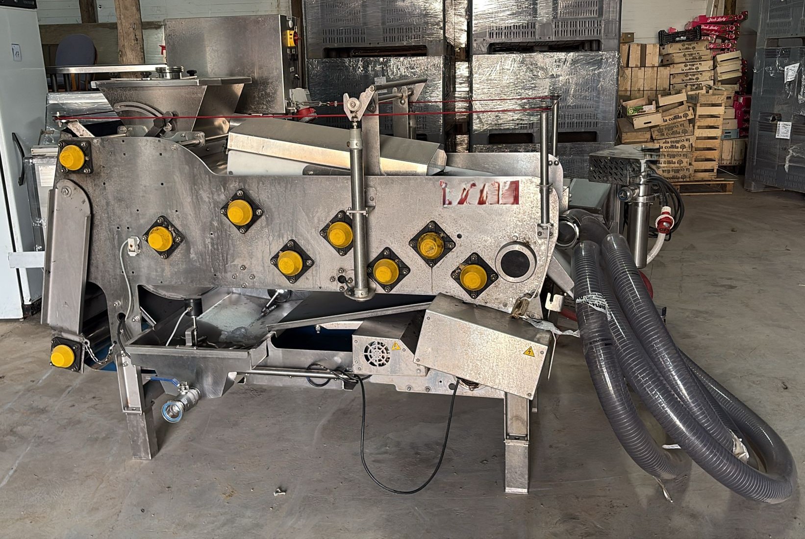 Übersicht Diese Bandpresse wurde 2019 von SRAML hergestellt. Die Maschine ist für die kontinuierliche Gewinnung von Saft aus zerkleinerten Äpfeln mittels eines kontinuierlichen Bandpresssystems ausgelegt. Sie war betriebsbereit, als sie aus der regulären Produktion genommen wurde, und wurde als Reservegerät gewartet. Die Maschine wurde durch eine Presse mit höherer Kapazität ersetzt. Technische Daten Leistung: 1.500 kg/h (Äpfel) Anwendung: Saftgewinnung aus zerkleinerten Äpfeln Konfiguration: Kontinuierliches Bandpresssystem mit mechanischem, selbstreinigendem Filtersystem Filtersystem: Mechanischer, selbstreinigender Filter zur Entfernung von Kernen und Stielen