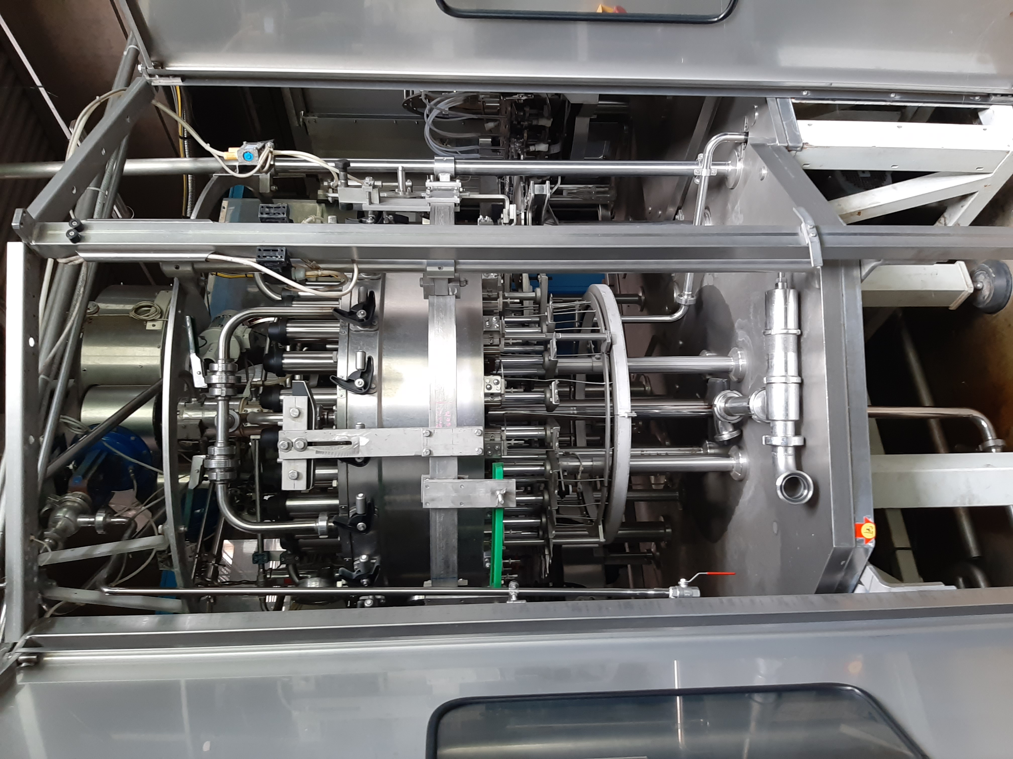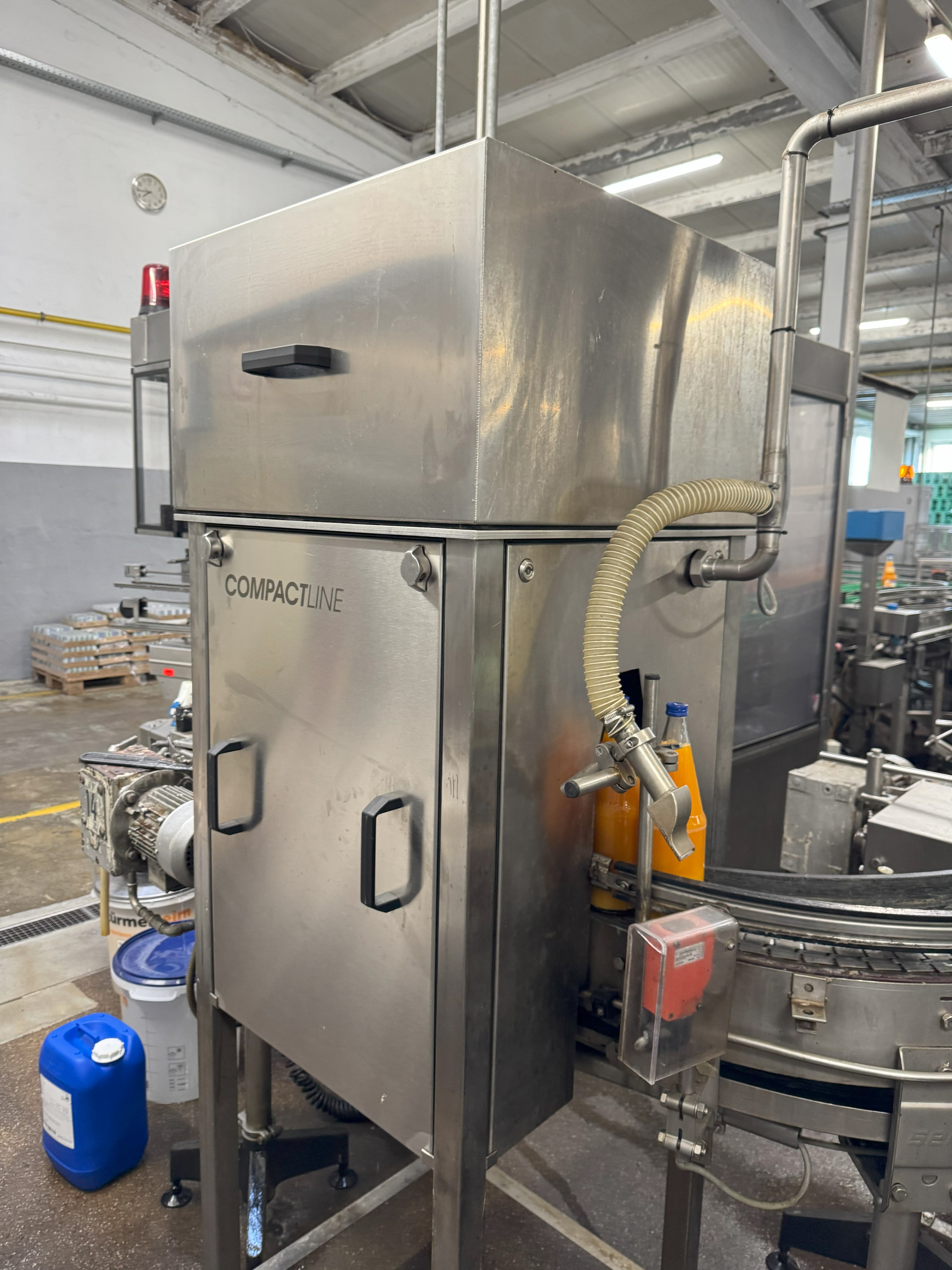Überblick  Der Rinser reinigt und sterilisiert Behälter und wurde im Jahr 2000 von dem deutschen Hersteller Krones gebaut. Die Maschine wurde bereits demontiert und eingelagert. Technische Details  Leistung: bis zu 32.000 Behälter/ h  Anzahl der Spülstationen: 50 (einige davon fehlen)  Laufrichtung: gegen den Uhrzeigersinn Behälter: Glas + Kunststoff  Benetzte Teile in V2A  Zentralschmierung Umfassende Dokumentation vorhanden Elektropneumatische Ventilsteuerung Siemens S7-Steuerung Spannung: 400 / 230 V Frequenz: 50 Hz Steuerspannung: 24 V DC