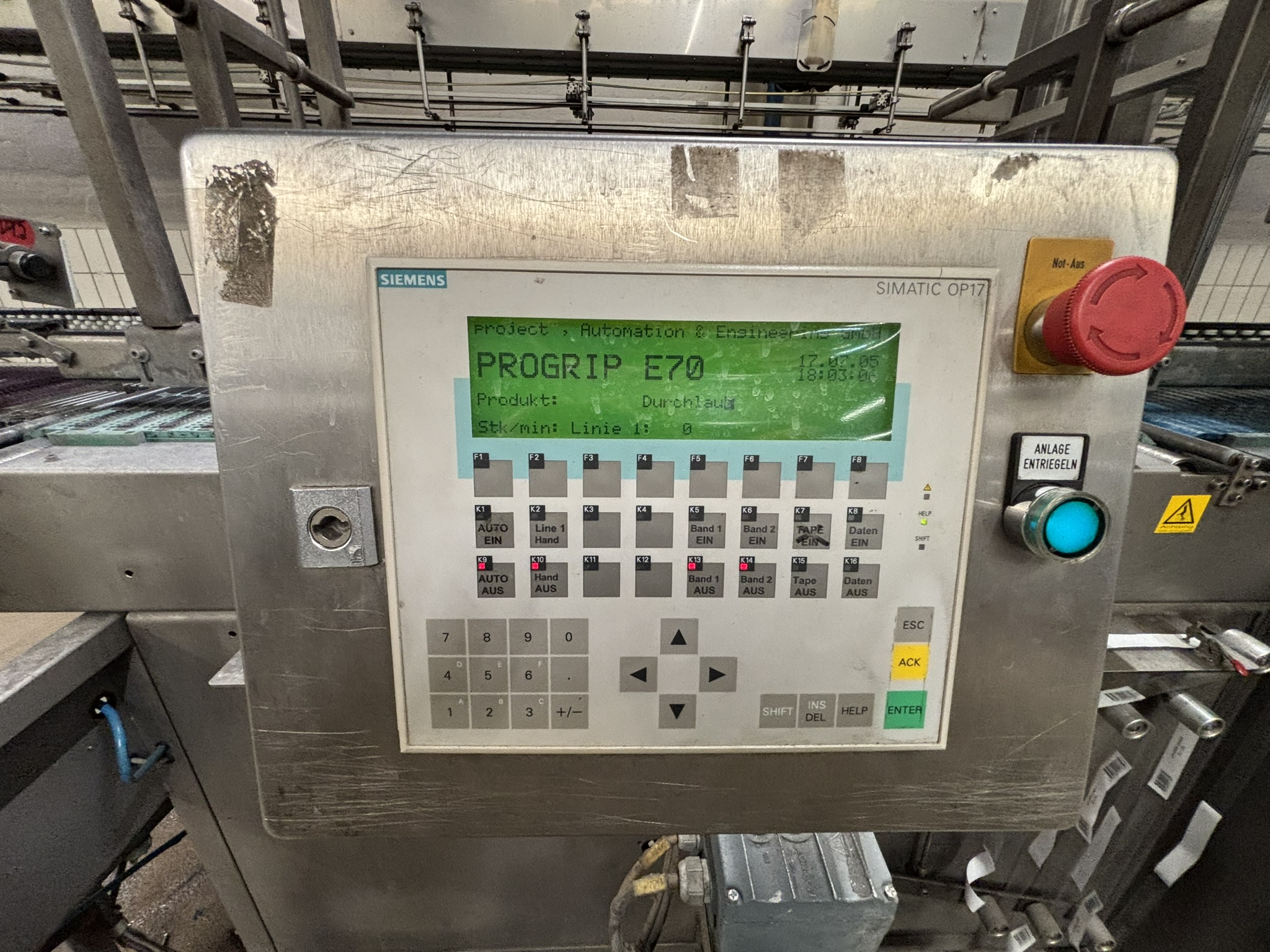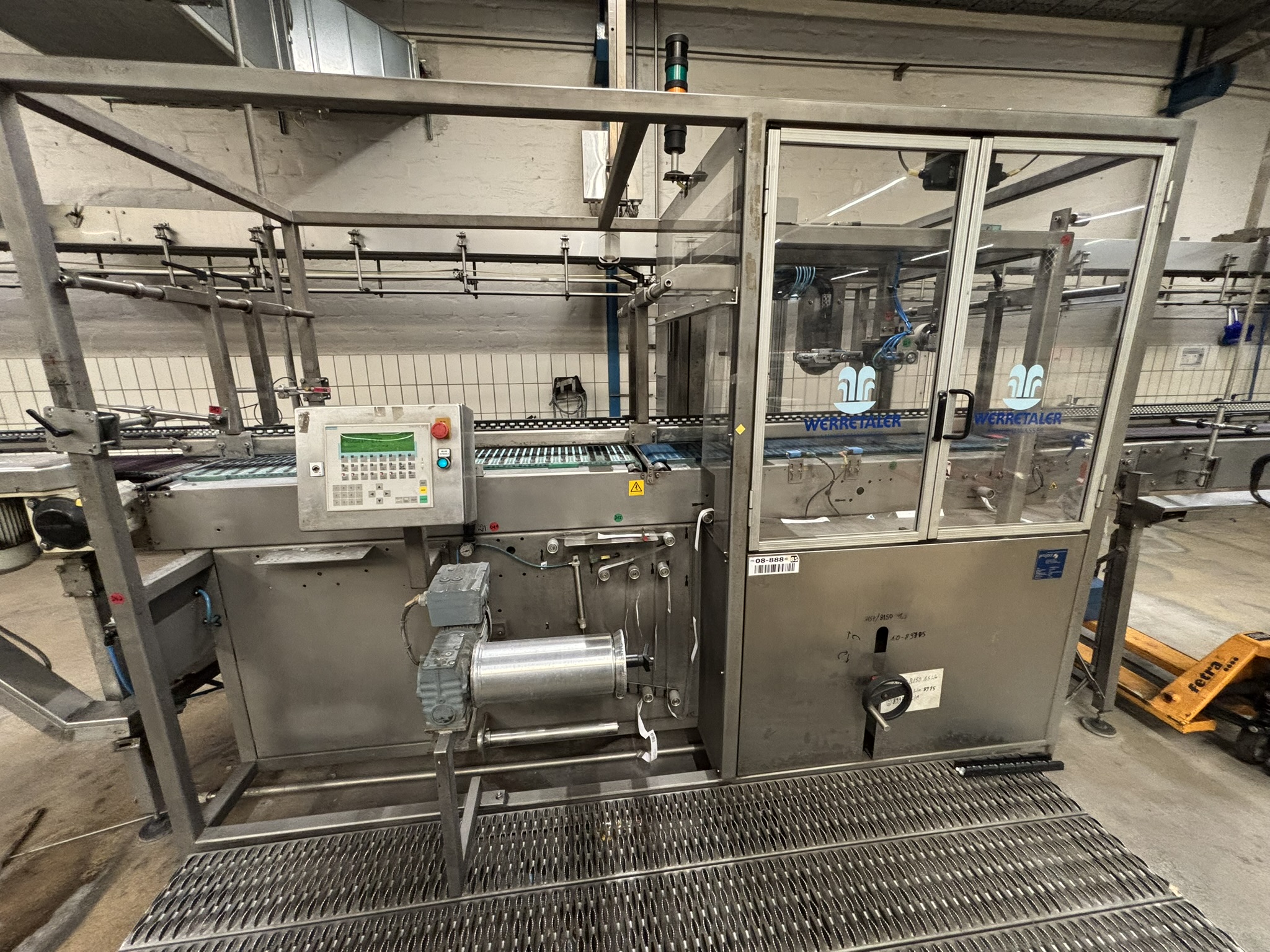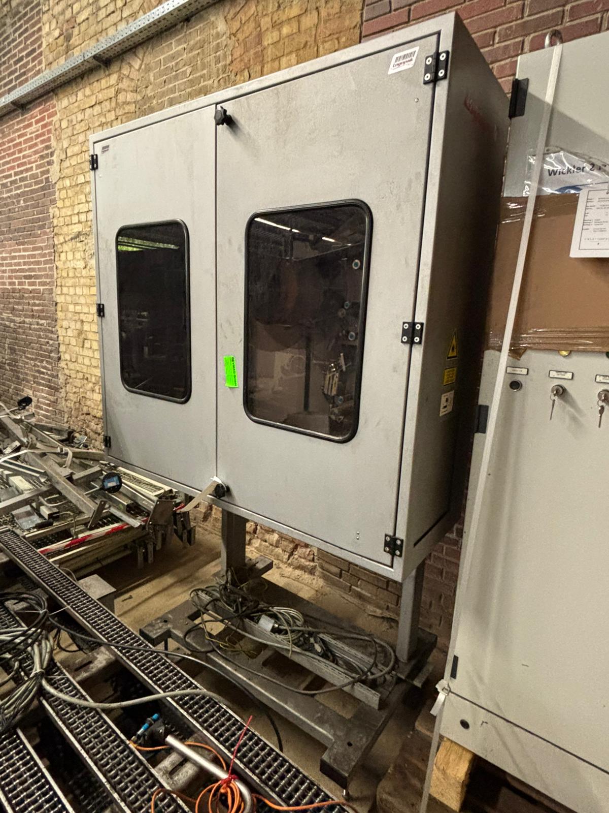 Übersicht Der Griffapplikator wurde 2001 von der deutschen Firma project Automation & Engineering GmbH hergestellt und war bis vor kurzem Teil einer PET-Abfüllanlage bei einem großen deutschen Softdrinkhersteller. Der Griffapplikator wird nun freigegeben. Technische Daten Gesamtleistung: 70 Zyklen/min Elektrischer Anschluss: 400 V/N/PE/50 Hz, 3,6 kW Zwei Bahnen Zusätzliche Informationen Mindesthaltbarkeitsdatum-Codierung Flasche verfügbar (Videojet Excel 170i Ultra High Speed) Förderband für Verpackungen verfügbar