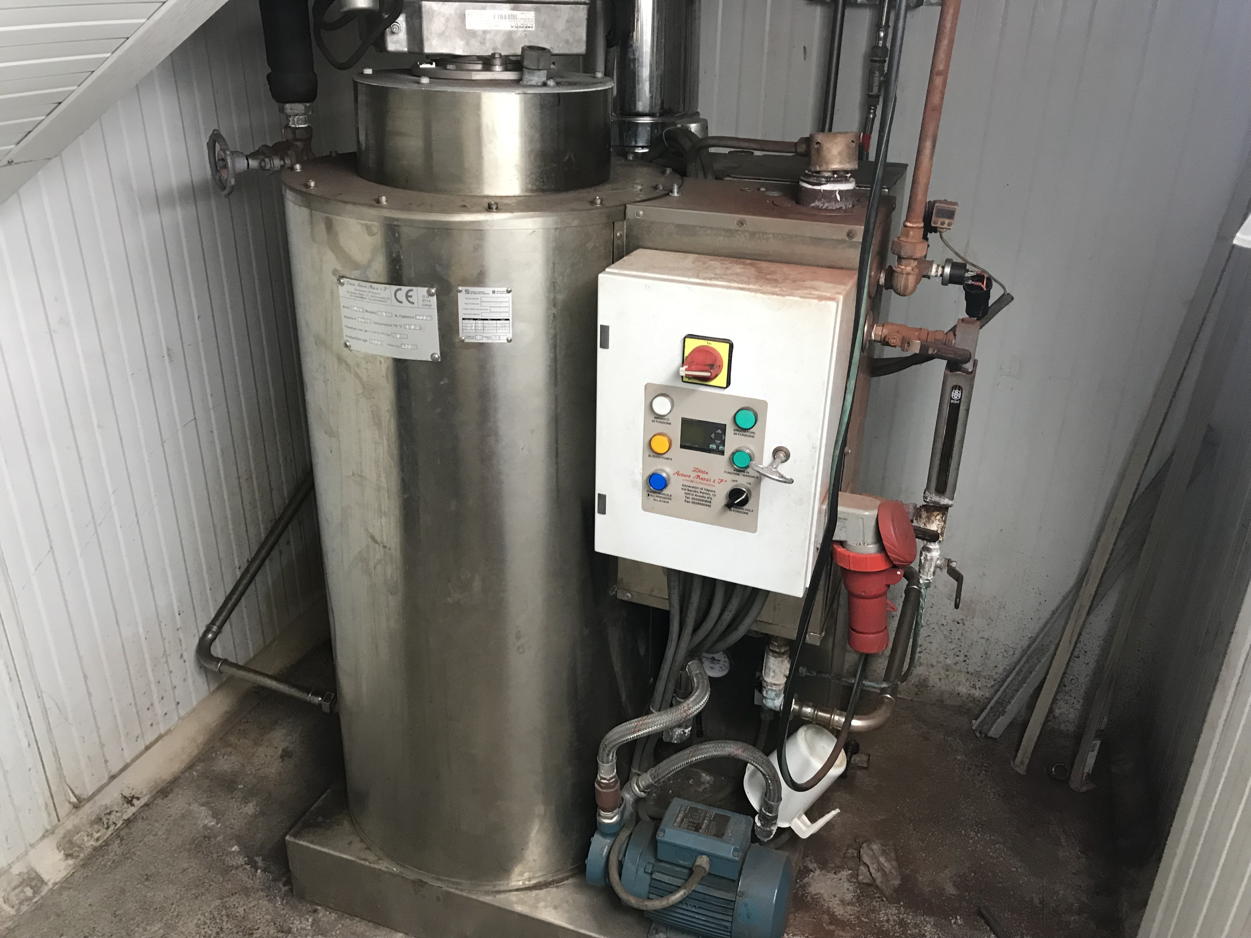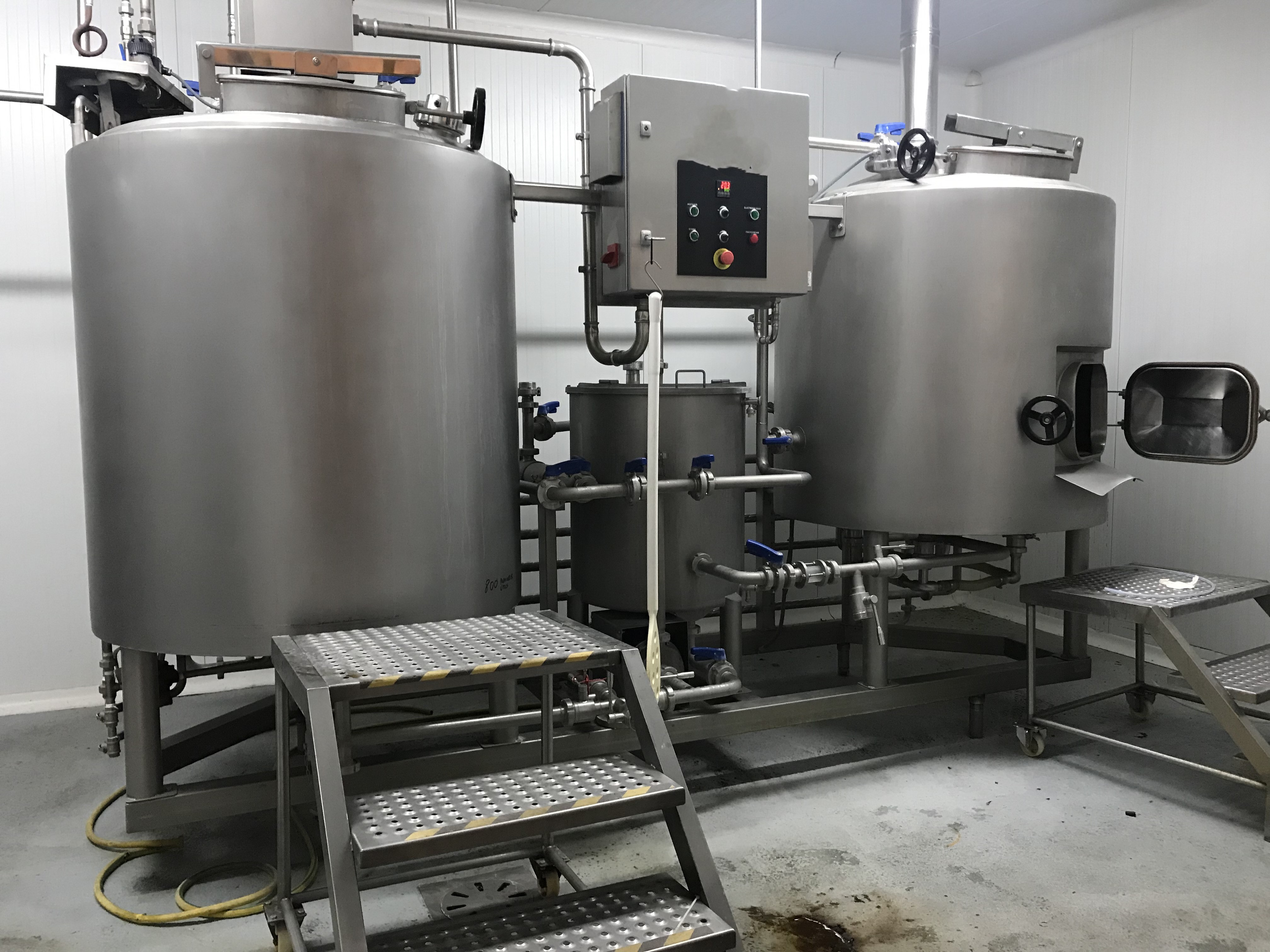 Übersicht Diese Kleinbrauerei musste vor kurzem ihren Betrieb einstellen. Ursprünglich war geplant, den Betrieb fortzuführen, aber da dies aus verschiedenen Gründen nicht möglich war, wird die gesamte Ausrüstung nun als Ganzes verkauft. Ausstattung Dampferzeuger mit Gasölbrenner und dessen Tank. Drehstrommühle zum Mahlen von Getreide. 800-Liter-Sudhaus mit Dampfmantel, bestehend aus Kessel, Filtertank, Lunge, Flottentank, Röhrenkühler, Tank für osmotisiertes Wasser und 3 für den Betrieb notwendigen Pumpen. Industrielle Osmose- und Entkalkungsanlagen. 4 atmosphärische zylindrisch-konische Fermenter mit Kühlmantel und einem Fassungsvermögen von 1000 Litern. 3 atmosphärische zyl ...