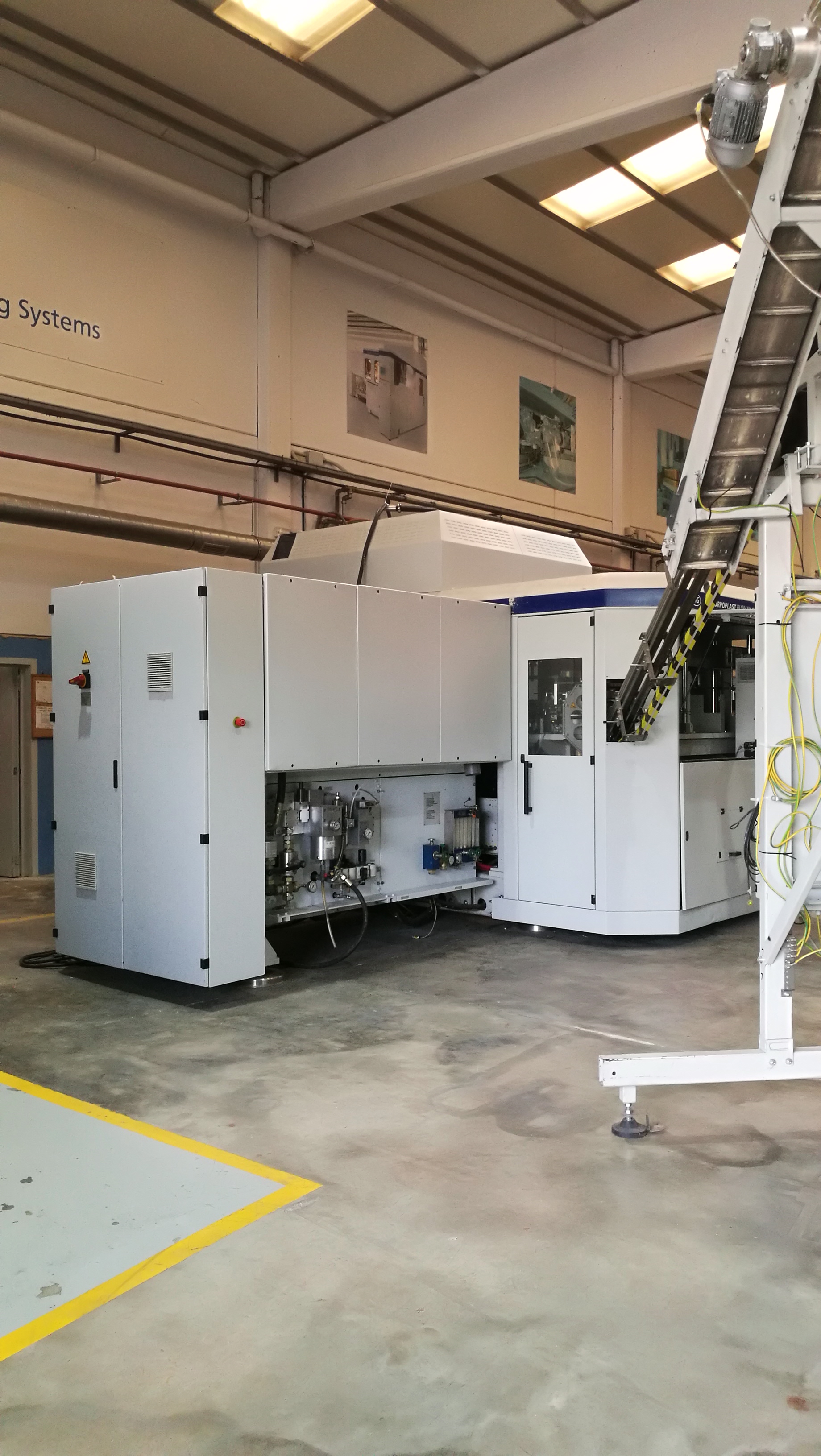 Überblick Die Blasmaschine BLOMAX 4 wurde im Jahr 2006 von der deutschen Firma SIG Corpoplast (heute KHS) hergestellt. Sie ist von einem Maschinenbauer überholt worden und kann im Trockenlauf besichtigt werden. Blasformen sind nicht enthalten, können aber beschafft werden. Technische Details  Leistung: bis zu 7.200 Fl./ h 4 Kavitäten Abmessungen: 4960 mm x 3900 mm x 3000 mm  Gewicht: 15 t  Betriebsstunden: 44.736  Flaschen Volumen: 200 ml - 2000 ml   Max. Durchmesser: 115 mm  Max. Länge: 350 mm Preforms  Länge: 60 - 200 mm Max. Stützringdurchmesser: 35 mm  Lieferumfang  Die Blasmaschine ist komplett ausgestattet mit dem System zur Preformzuführung (Silo, Aufzug, Sortierung, ...