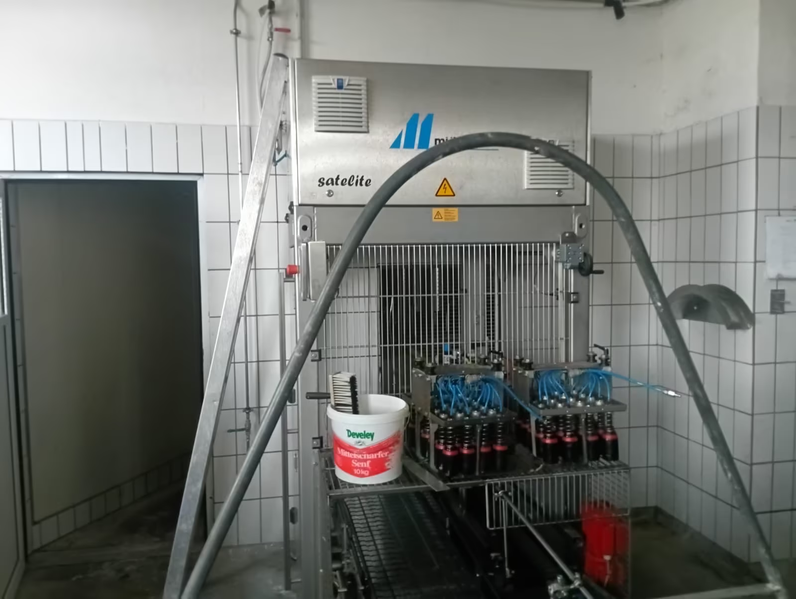 Überblick  Die Flaschenreinigungsmaschine wurde im Jahr 2011 von der deutschen Firma Krones gebaut. Sie war bis zuletzt bei einem großen Getränkehersteller im Einsatz und ist noch montiert. Technische Details  Kapazität: 20.000 Fl/h Formate: 0,25l und 0,75l Anzahl der Flaschen pro Reihe: 22 Siemens S7 Ausstattung Etikettenaustragung Drehrohrspritzung Kontinuierliche Maschine  Edelstahlkorpus Dokumentation  Softwarebackup Pumpen aus Edelstahl Leitwertmessung Fingeraufgabe Ersatzteile Flaschenzellenspitzen Flaschenzellenträger