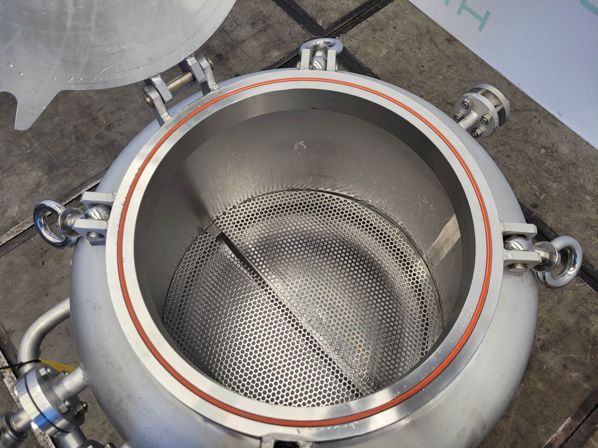 General SKU360U952 StandortBarneveld HerstellerHoeksma & Velt Leeuwarden №002-369 Baujahr1990 Pressure Betriebsdruck3 Bar Betriebsdruck Doppelmantel2 Bar Anzahl der vertikalen Druckbehälter1 Haupteigenschaften MaterialEdelstahl Inhalt3000 Ltr. Druck3 Bar Spezifizierte Eigenschaften - Druckkessel MaterialEdelstahl 1.4404 (316L) Benannte StelleTÜV Inhalt3000Ltr. KesselabmessungenDia: 1700x1700 mm Klöpper Obenseitecheck Klöpperbodencheck MannlochDN400 ObenanschlüsseDia: 50 mm, 22 mm(4x) AuslaufDia: 50 mm Max. Temperatur150°C Mit Doppelmantelcheck Max. Temperatur150°C Information Gebaut auf Füssecheck Platzbedarf2x2 m Totalhöhe2,5 m Gewicht900 kg Was Sie von Maschinen von  ...