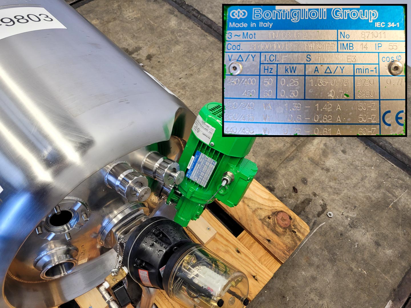 General SKU404U1222 StandortBarneveld HerstellerBaumgartner & Co. / Alois Binderberger №561 Baujahr2004 Pressure Betriebsdruck4 Bar Haupteigenschaften MaterialEdelstahl Inhalt103 Ltr. Druck4 Bar Spezifizierte Eigenschaften - Druckkessel MaterialEdelstahl 1.4301 (304), Edelstahl 1.4435 (316L) Inhalt103 Ltr. Kesselabmessungendia. 450x600 mm Klöpper Obenseitecheck ObenanschlüsseDN50 (CIP), DN50 AuslaufDN25 Max. Temperatur-15/150 °C Mit Propellorrührwerkcheck (magnetic) Motor0.25 kW, 230/400 volt, 2720 rpm Wellendrehzahl± 200 rpm Information Platzbedarf0,74x0,74 m CEcheck Totalhöhe1,2 m Gewicht200 kg Was Sie von Maschinen von Foeth erwarten können: -- Maschine funktioniert fäh ...