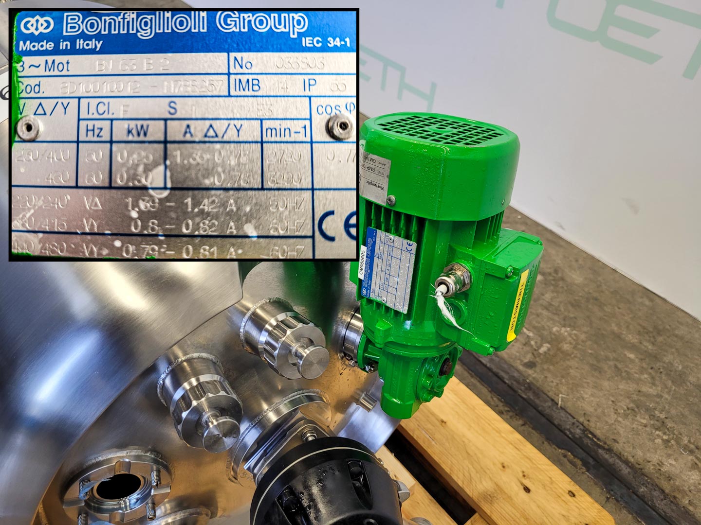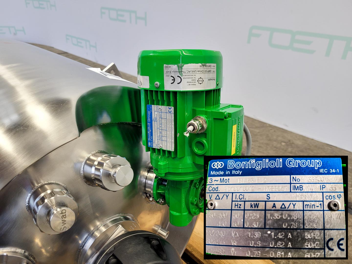General SKU376X938 StandortBarneveld HerstellerWalter Brucks Typ8HP №1530 Baujahr1961 Haupteigenschaften MaterialEdelstahl Motor0.55 KW Einlass durchm.640 mm Spezifizierte Eigenschaften - Dragierkessel MaterialEdelstahl 1.4306 (304L) Dragierkesselcheck Kesseldurchmesser950 mm Kesseltiefe580 mm Ein-/Auslauf640 mm Kesselwinkel verstellbarcheck Motor0,55 kW (400 V, 1450 rpm) Kesseldrehzahl12/20/24 rpm Information Gebaut auf Gestellcheck Totalhöhe1,4 m Gewicht300 kg Platzbedarf0,8 x 1,2 m Was Sie von Maschinen von Foeth erwarten können: -- Maschine funktioniert fähig -- Zu einem reduzierten Preis im Vergleich zu Neuem -- Bereit, überall auf der Welt zu versenden -- Gerne können S ...