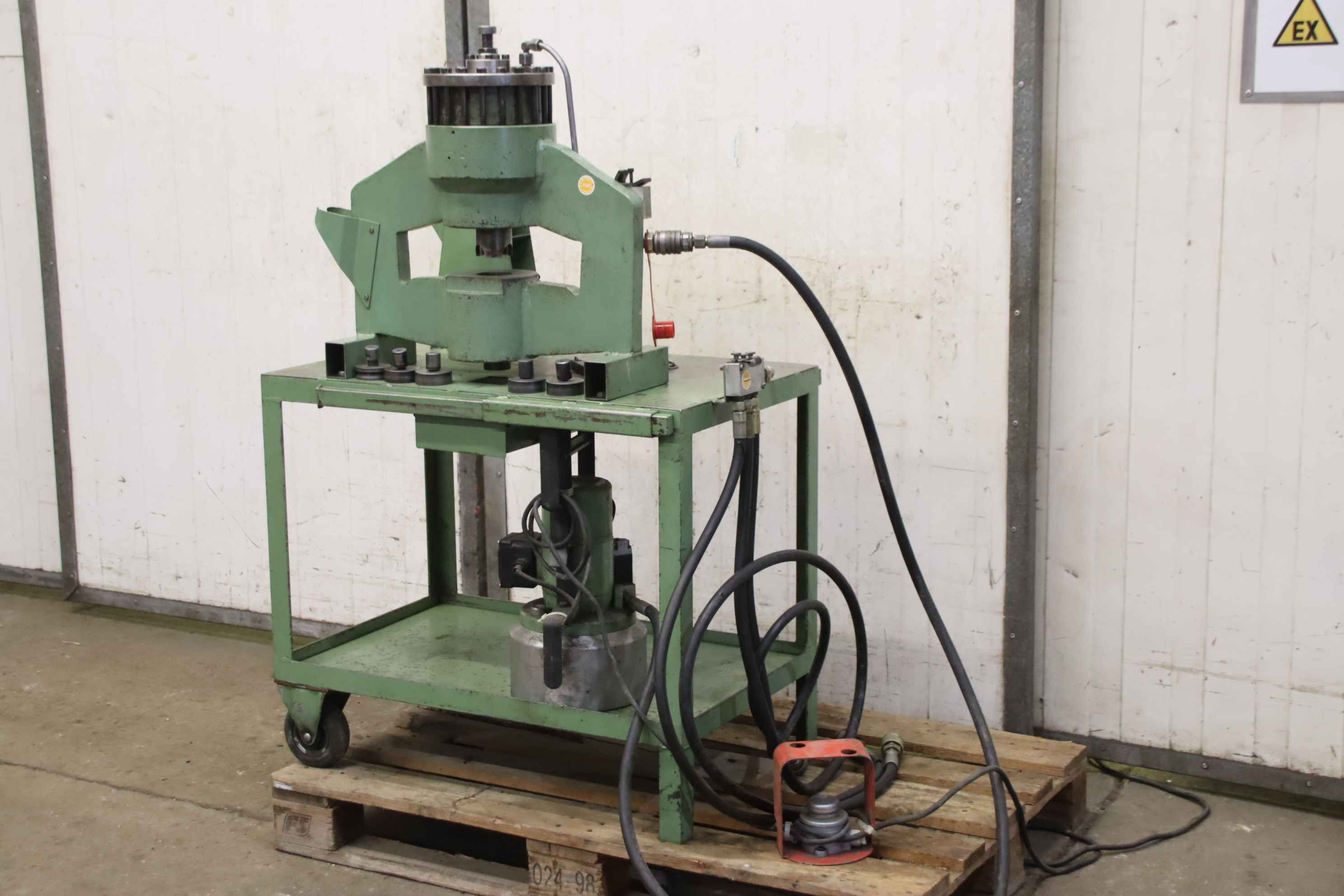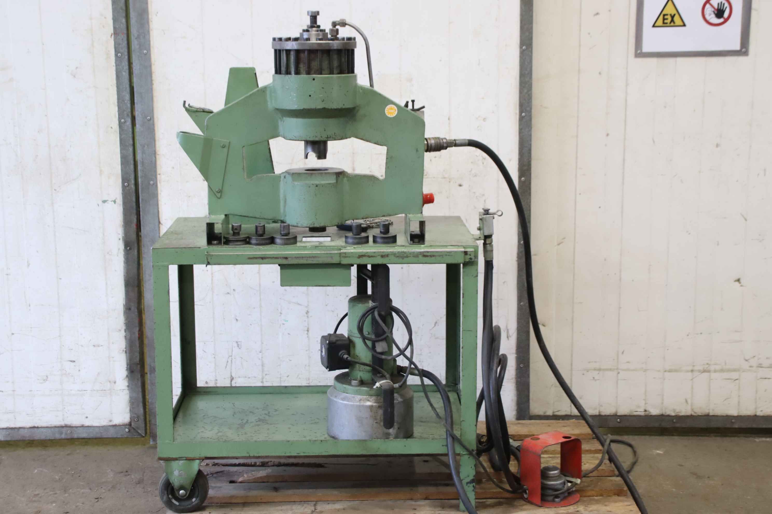 Hydraulikpresse, Ölhydraulische Presse, Pressmaschine, Presswerkzeug, Presszange-Hydraulische Presse: Hydraulikaggregat novopress Typ WK 9483-Druck: max. 150 bar / 0,45 l/min-mit Stanzsatz: 1x Ø 18mm, 2x Ø 14mm, 1x Ø11 mm, 1x Ø 9mm-Bedienung: Fußpedal-Anschlussschläuche: für Presszangen oder Ähnliches-Abmessungen: 850/550/H1250 mm-Gewicht: 158 kg