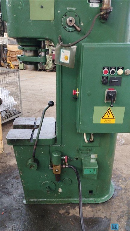 Druck: 150 tStänderweite: 300 mmHub: 180 mmEntfernung Tisch/Stößel, gr. Hub oben, Verst. oben: 300 mmTischfläche: 570x180 / 300x410 mmTischhöhe über Flur: 875 mmseitlicher Ständerdurchgang: 180 mmStößelfläche: 180 mmGeschwindigkeit ab: 250 mm/sGeschwindigkeit auf: 160 mm/sArbeitsgeschwindigkeit: 6 - 12 mm/sÖlinhalt: 250 lAntriebsleistung: 11,0 kWGewicht: 2,4 tRaumbedarf (BxTxH): 1,3 x 1,3 x 2,4 mUVV: für Handeinlegearbeiten zugelassen: UVV 11.064 - VBG 7n5.2 § 20 Fundamentgrube: nicht erforderlich