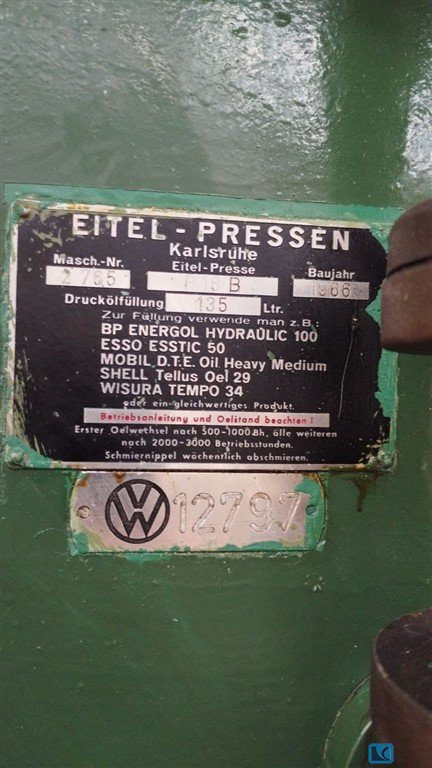 Druck: 200 tStänderweite: 970 mmHub: 360 mmEntfernung Tisch/Stößel, gr. Hub oben, Verst. oben: 630 mmTischfläche: 1000 x 800 mmAuswerferkraft: 10 tAuswerferhub im Tisch: 160 mmTischhöhe über Flur: 850 mmseitlicher Ständerdurchgang: 400 mmStößelfläche: 1000 x 800 mmGeschwindigkeit ab: 420 mm/sGeschwindigkeit auf: 410 mm/sArbeitsgeschwindigkeit: 50 mm/sÖlinhalt: 1240 lRückzugskraft: 24 tAntriebsleistung: 45,0 + 15,0 kWGewicht: 16,0 tRaumbedarf (BxTxH): 2,7 x 2,5 x 4,3 mUVV: für Handeinlegearbeiten zugelassen: UVV 11.064 - VBG 7n5.2 Stößelverriegelung: mechanisch Fundamentgrube: nicht erforderlich