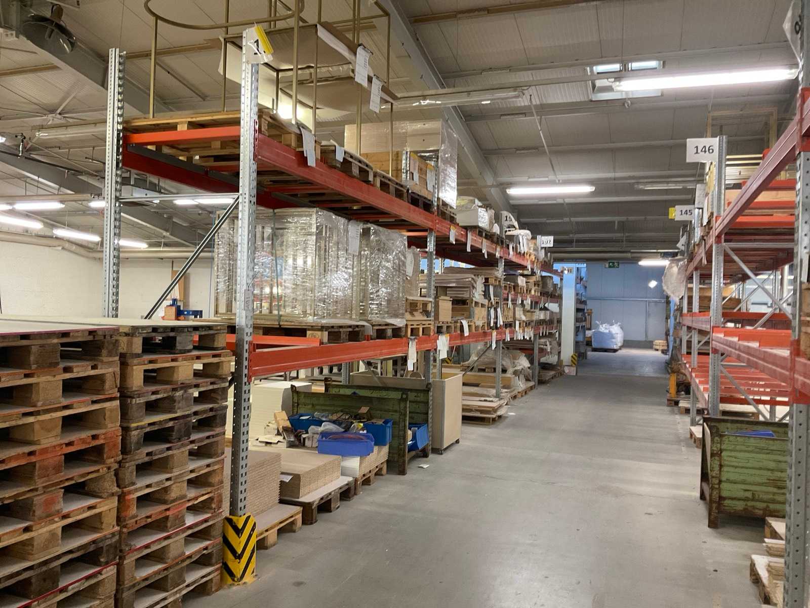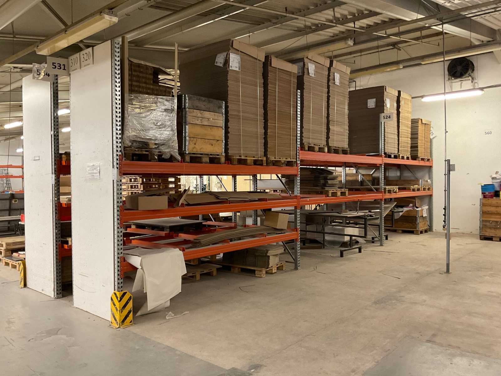 Schwerlastregal bestehend aus: 3 Ständer ca. 1100x3300mm, 12 Traversen ca. 3600mm, inkl. Palettenaufnahmen, mit Inhalt Auktions-ID: A7-45254-368