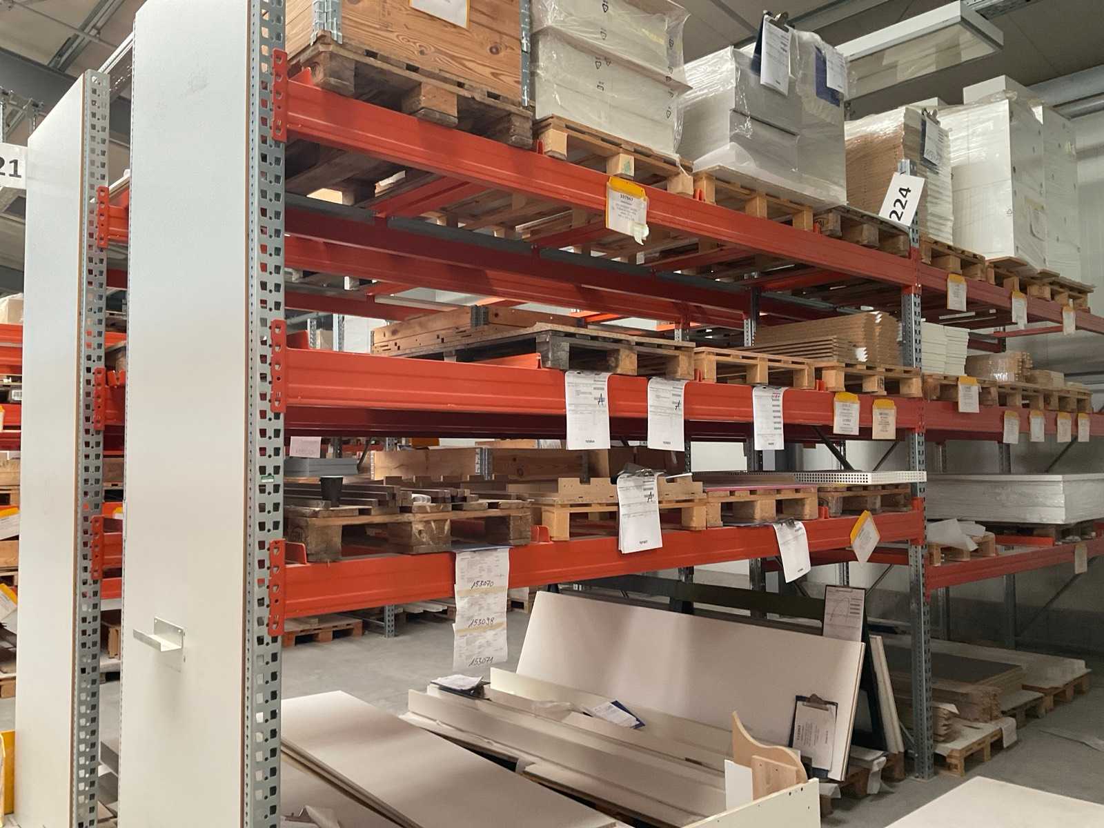 Schwerlastregal bestehend aus: 4 Ständer ca. 1100x3300mm, 22 Traversen ca. 3600mm, inkl. Palettenaufnahmen, mit Inhalt Auktions-ID: A7-45254-604