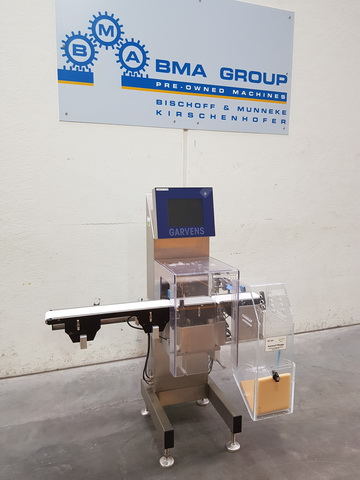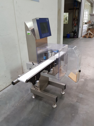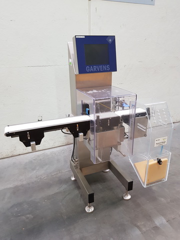 Garvens TopLine VS2 Bandkontrollwaage mit Schlechtauswurf mit Auffangbehälter und Kontrollstreifendrucker (Thermodrucker), Höchstlast 300 g, Eichwert e=0,1 g, Genauigkeitsgrad +/-0,1 g, Bandbreite 120 mm, Achsabstand Ein- und Auslaufband 250 mm, Achsabstand Wiegezelle 200 mm Förderrichtung von links nach rechts, Leistung bis zu 400 Wägungen pro Minute, Netzanschluss 230V/50/60Hz, Maschinengrundfläche ca. 900 x 900 mm (BxT), Maschinenhöhe ca. 1400 mm, Maschinennettogewicht ca. 85 kg