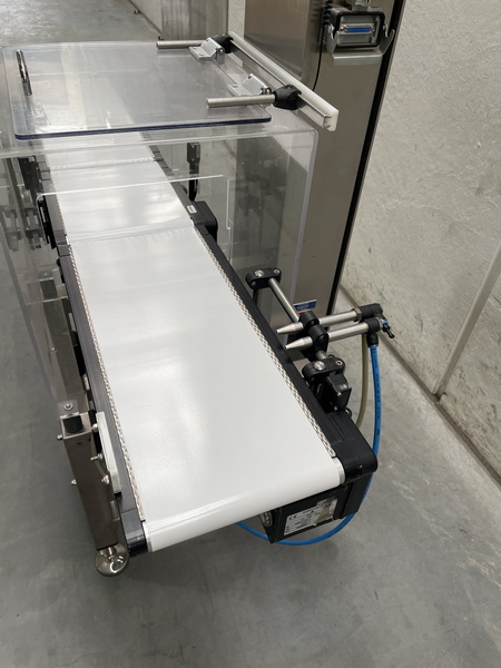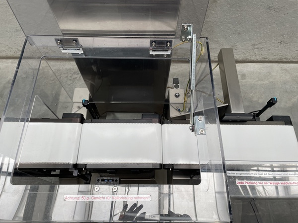 • Wägebereich max. 300 g • Bandgeschwindigkeit 10-40 m/min • Achsabstände Einlaufband/Wiegeband/Auslaufband 600/200/250 mm • Bandbreite 100 mm • Auflösung d= 0,1 g • Genauigkeit e= +/- 0,1 g • Temperaturbereich 0-40°C • Wägezelle BF8 D-G-P • Bandlauf von links nach rechts • Schlechtauswurf durch 1 Luftdüse • Schnittstelle RS 232 • Höhenverstellbar • Neue Laufänder Kunststoff weiss • Anschluß 230V/50Hz