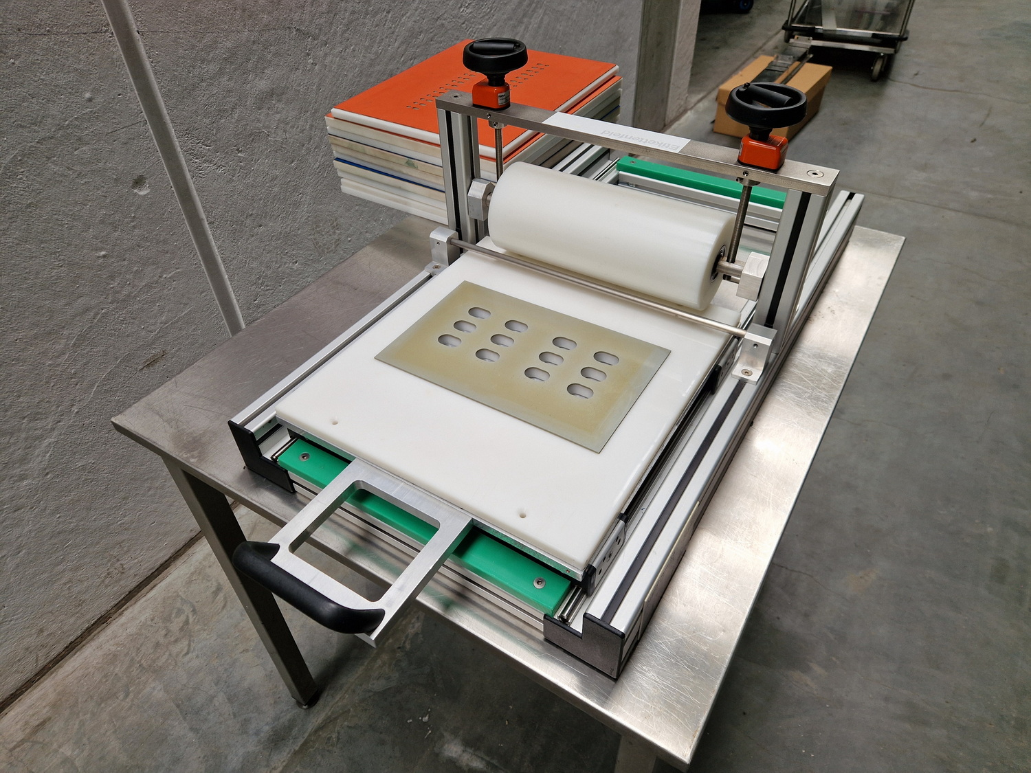 • Ideal für die schnelle Konfektionierung kleinerer Stückzahlen von z.B. Tabletten • Blister werden in wenigen Schritten sekundenschnell verklebt • Der Anpressdruck ist über eine Scala fein regulierbar • Formatwechsel sind innerhalb weniger Minuten vollzogen • Die Artikel werden thermisch nicht belastet • Für Formatplatten (B x T) 480 x 360 mm • Mit 1 Formatplatte • Rein manuell arbeitend, keine Elektrik/Pneumatik • Ohne Untertisch