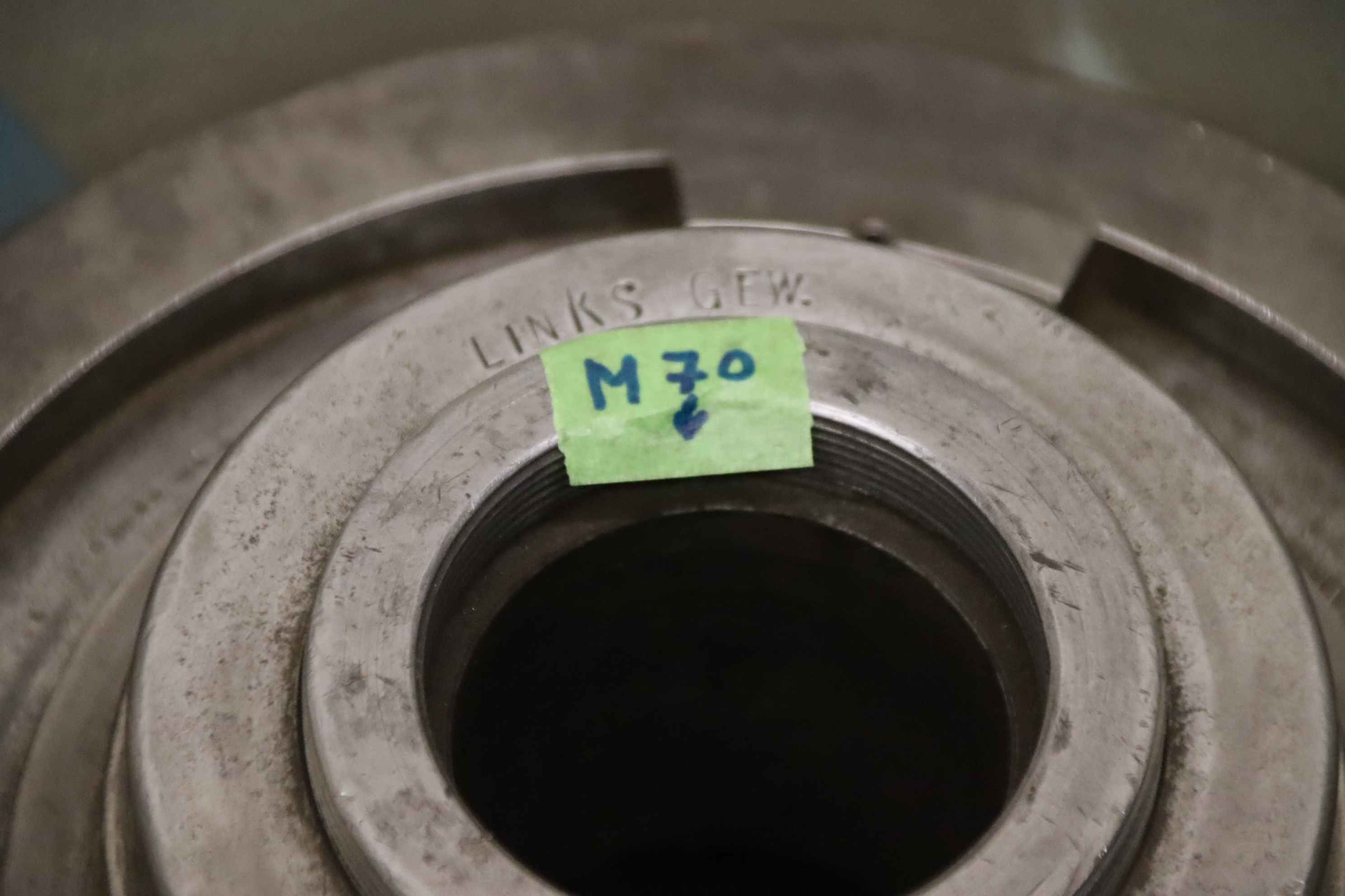Schleifscheibenaufnahme, Standardflansche, Sonderflansche, Schleifscheibenflansch-Schleifscheibenaufnahme: mit Schleifstein-Aufnahme: Ø 55 mm, Gewinde M60 siehe Fotos-Schleifstein: Dorfnerwerk Typ 5A 100-JOT8-UEH 400 x 40 mm-Transportabmessung.: Ø 440 x 85 mm-Gewicht: 32,6 kg