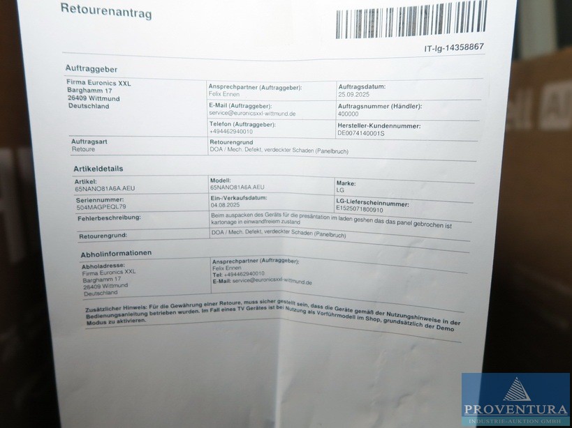 Flachbildfernseher LG NanoCell AI 65 Zoll, 65NANO81A6A, org. verpackt, NEU aber Panelbruch
