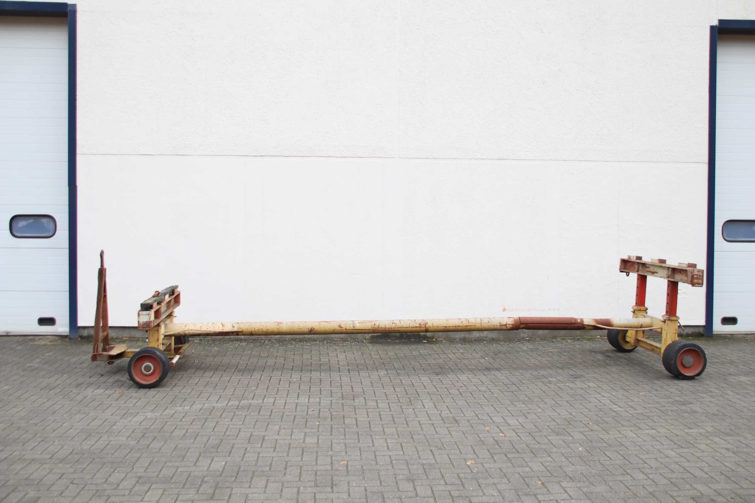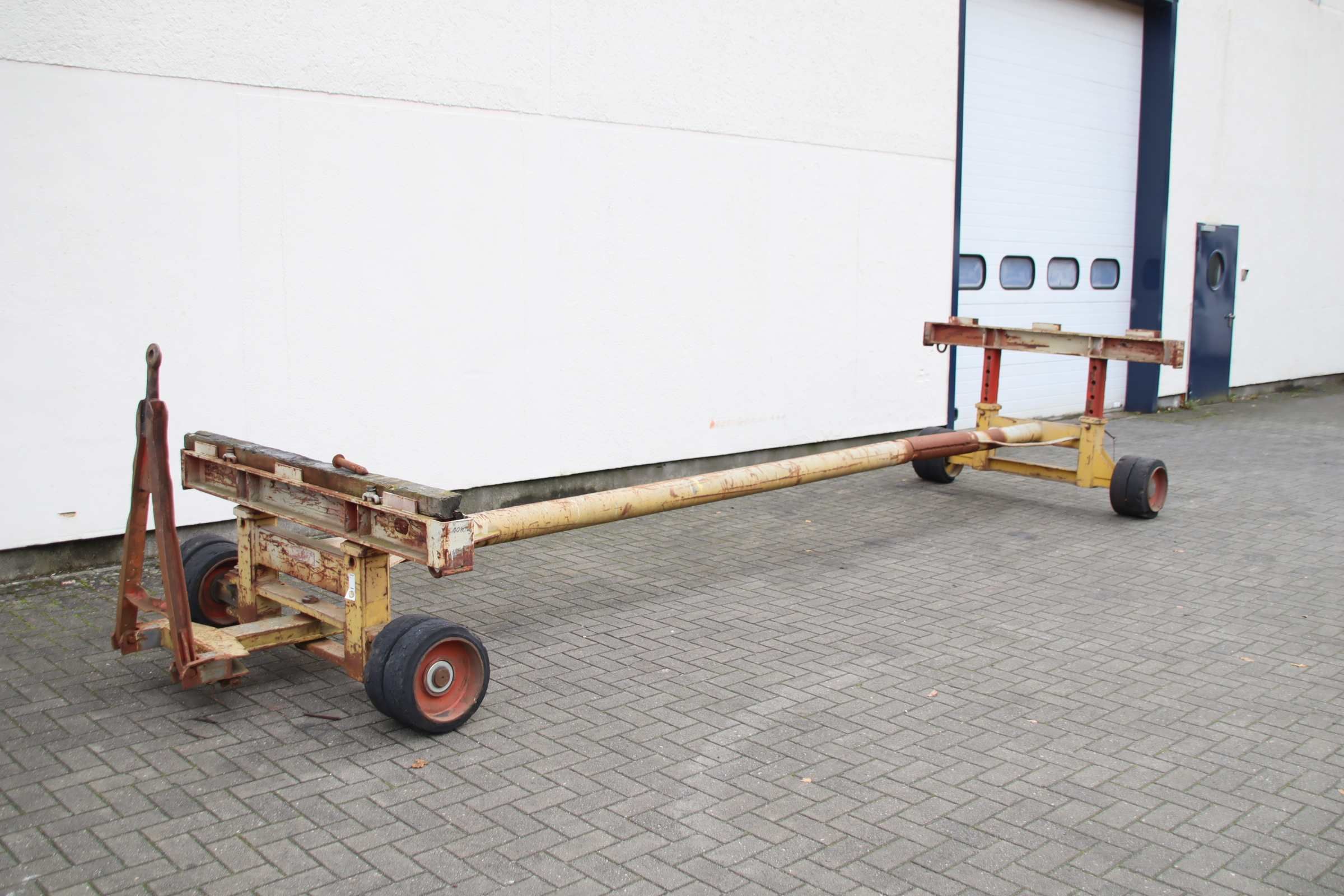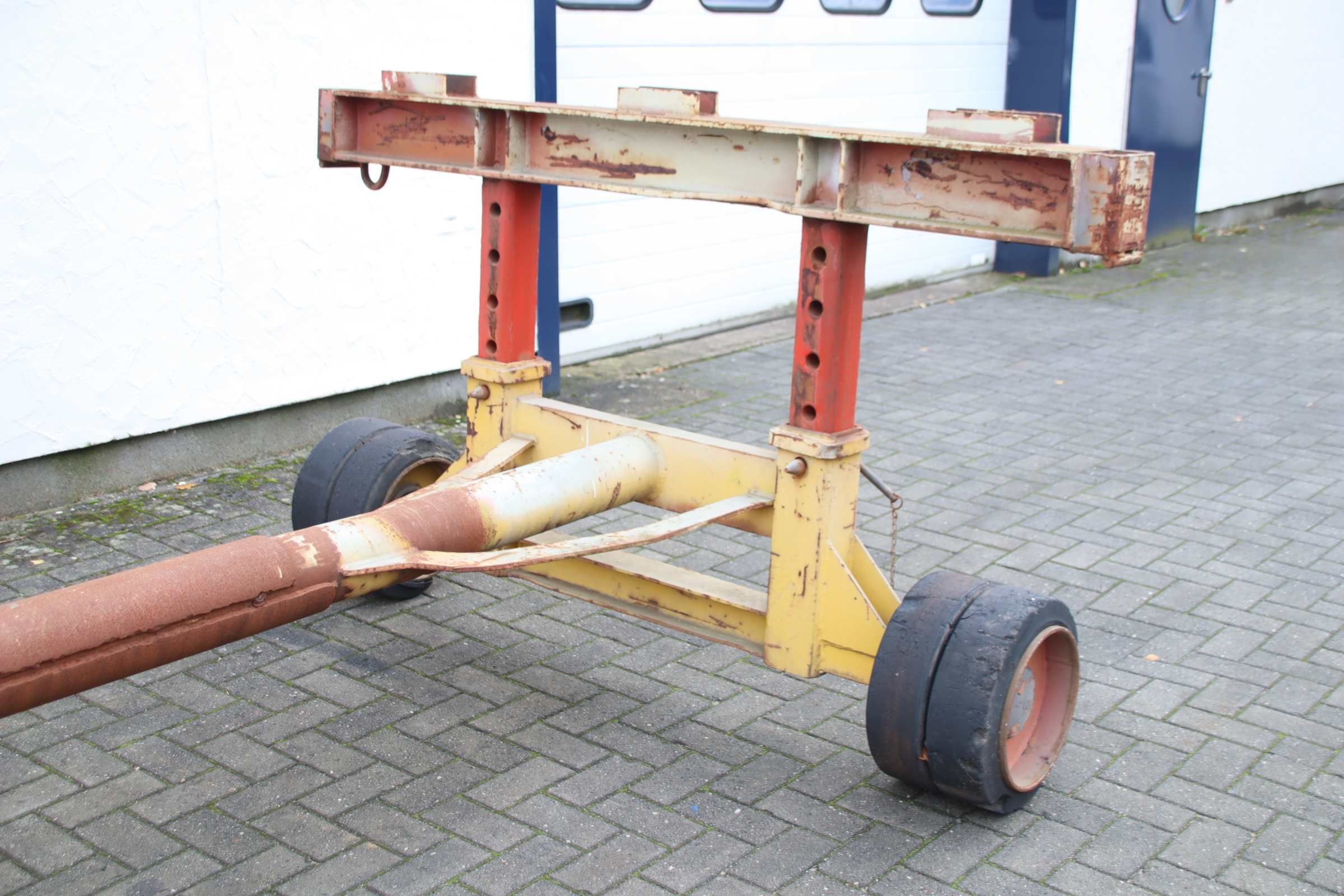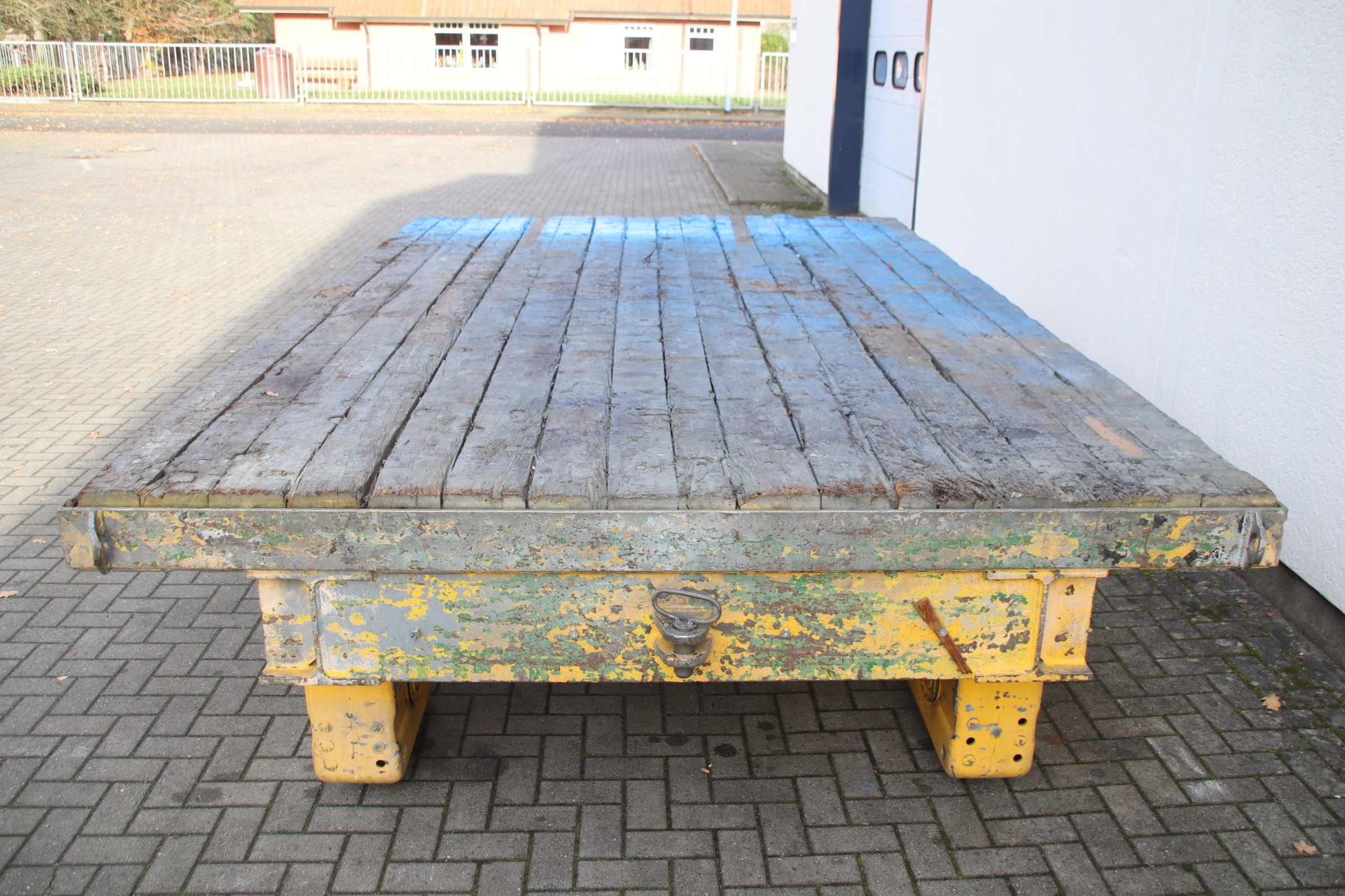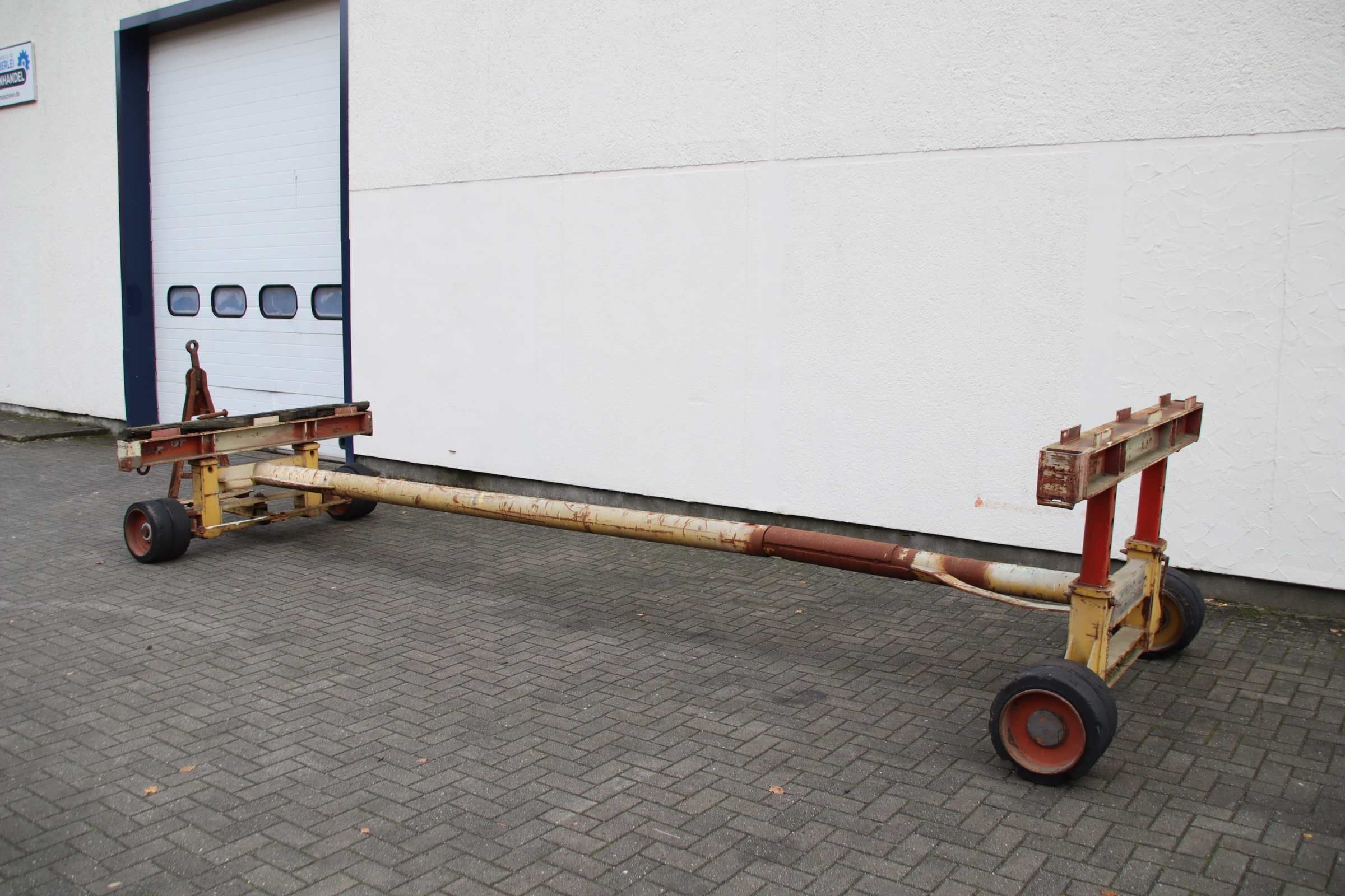 Plattformwagen, Transportwagen, Schwerlastwagen, Tischwagen, Montagewagen, Industrieanhänger, container Dolly, Doppel-Drehschemel-Lenkung, Schwerlastanhänger-Übergabe: im Ist-Zustand wie besichtigt-Bemerkung: Zustand Räder beachten-Schwerlast-Transportwagen: Industrieanhänger mit 1-Achs-Lenkung-Trägerabstand: 5860 mm / Höhe 850 bis 1255 mm verstellbar-Traglast: 11 t-Bereifung: 405/130-305 Vollgummi Doppelbereifung-Abmessung ges.: 7600 /2000/H850 mm-Gewicht: 1080 kg