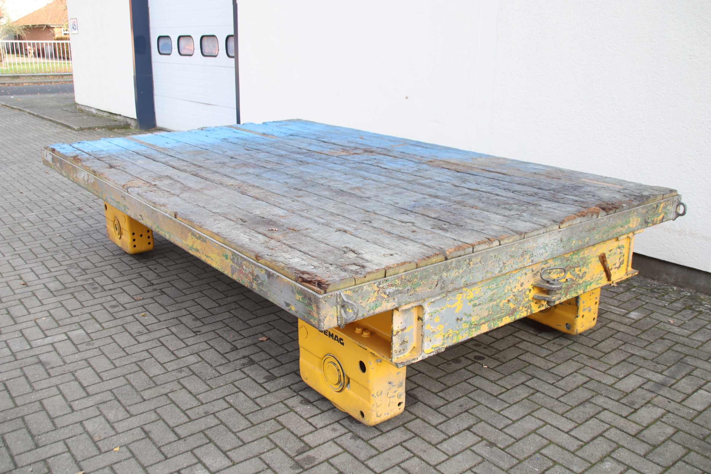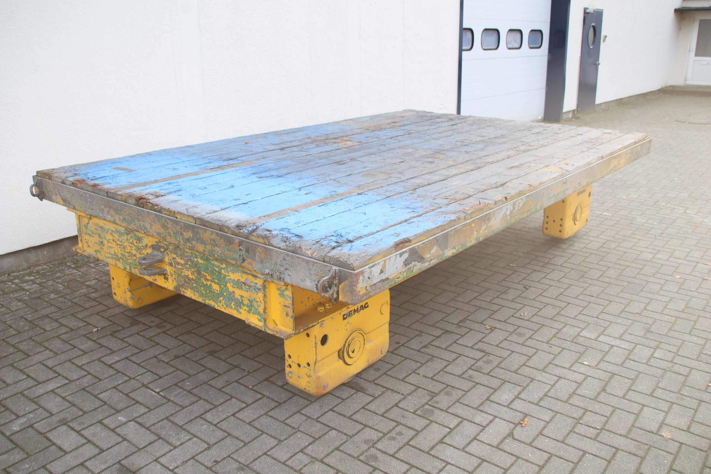 Transportwagen, Schwerlastwagen, Elektro Schwerlastschienenwagen, Schienenwagen-Hersteller: Demag, Schwerlastschienenwagen-Plattform: 3980 x 2500 mm-Traglast: 40.000 kg-Rollenabstand: 1505 mm-Abmessung ges.: 4160/2500/H885 mm-Eigengewicht: 3360 kg