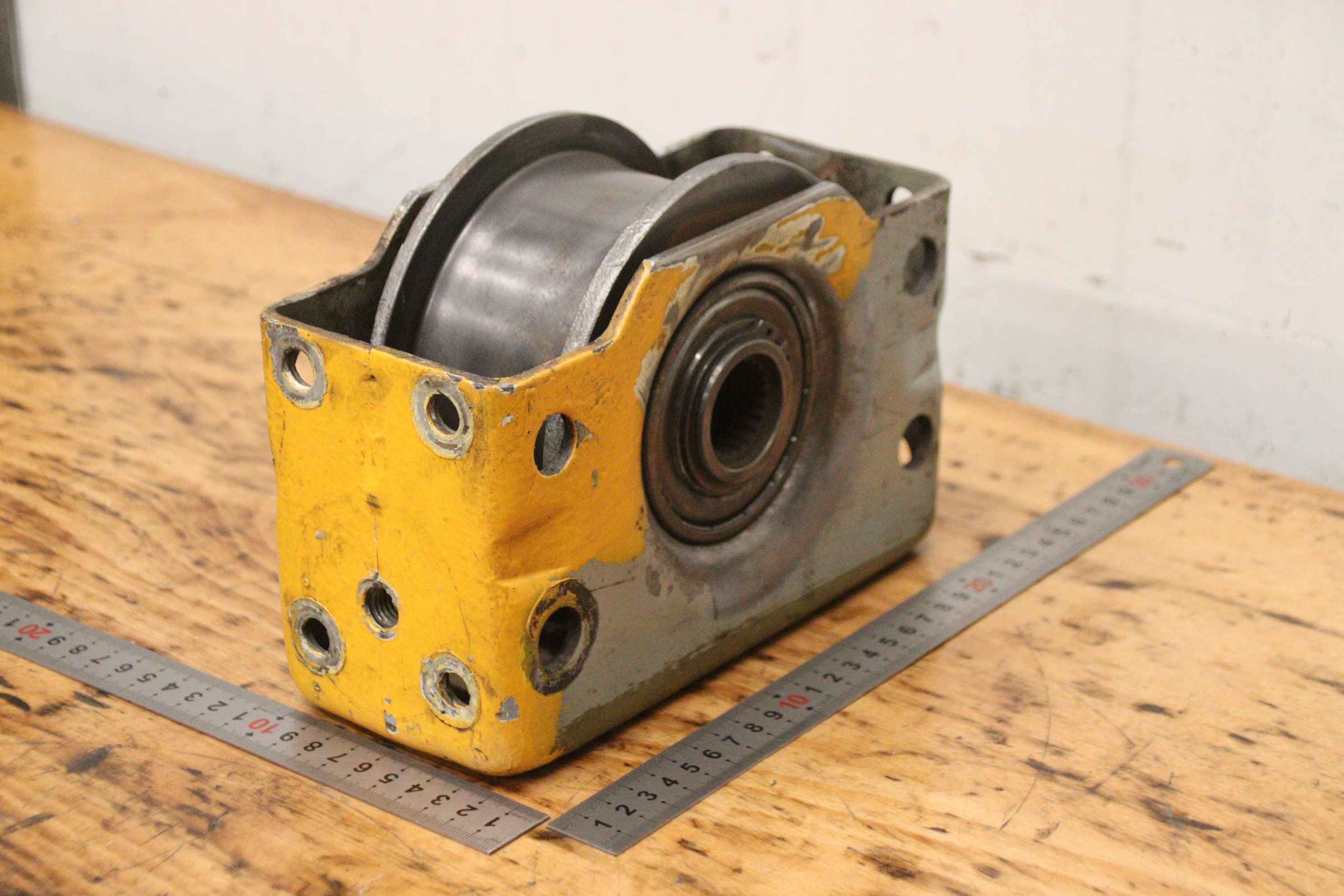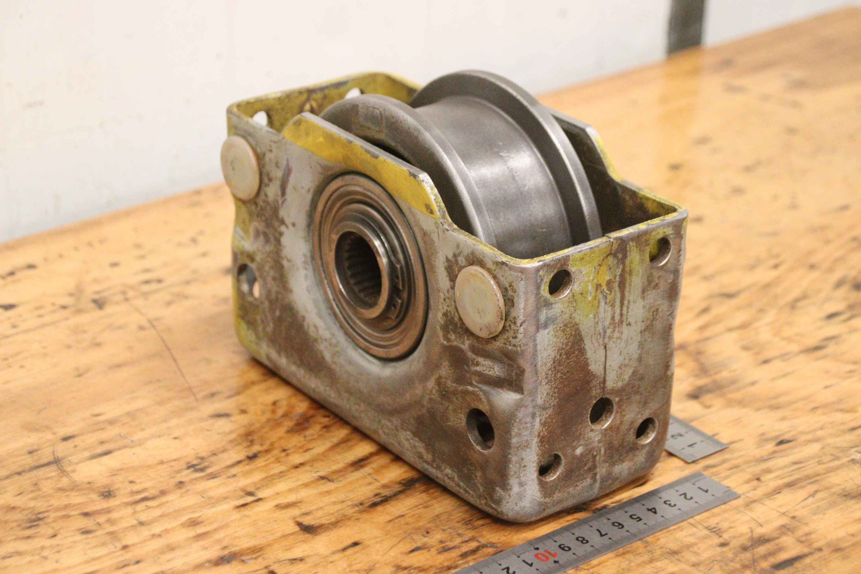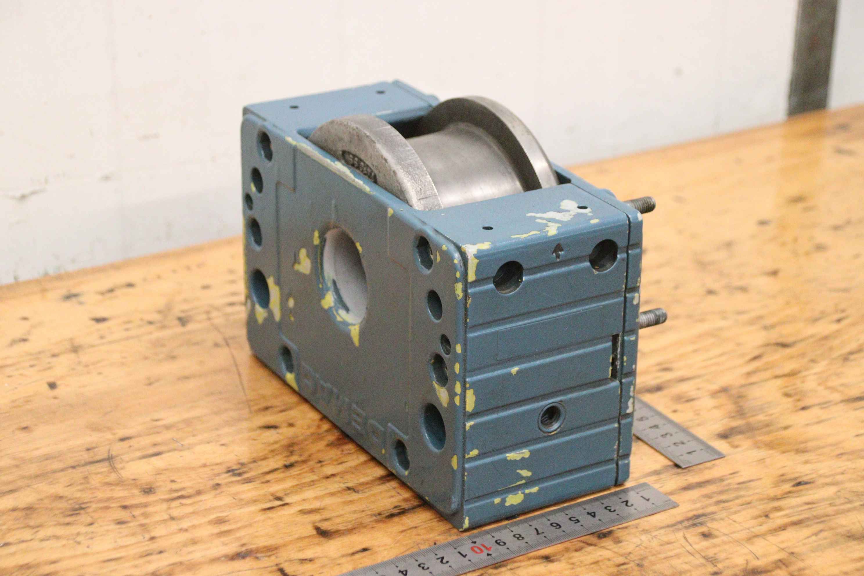 Reibrad, Laufrad für Brückenkran, Brückenkran, Hallenkran, Montagekran, Arbeitsplatzkran, Radblock, Radblocksystem, Radblock-System-Hersteller: Demag, Radblock für Kranfahrwerk-Typ: leider keine genaue Typbezeichnung-Laufrad: Ø 122 mm / Schienenbreite Zwischenmaß 63 mm-Aufnahme: Ø 30 mm, Maße siehe Fotos-Anzahl: 1x Radblock vorhanden-Abmessungen: 220/97/H160 mm-Gewicht: 8,5 kg