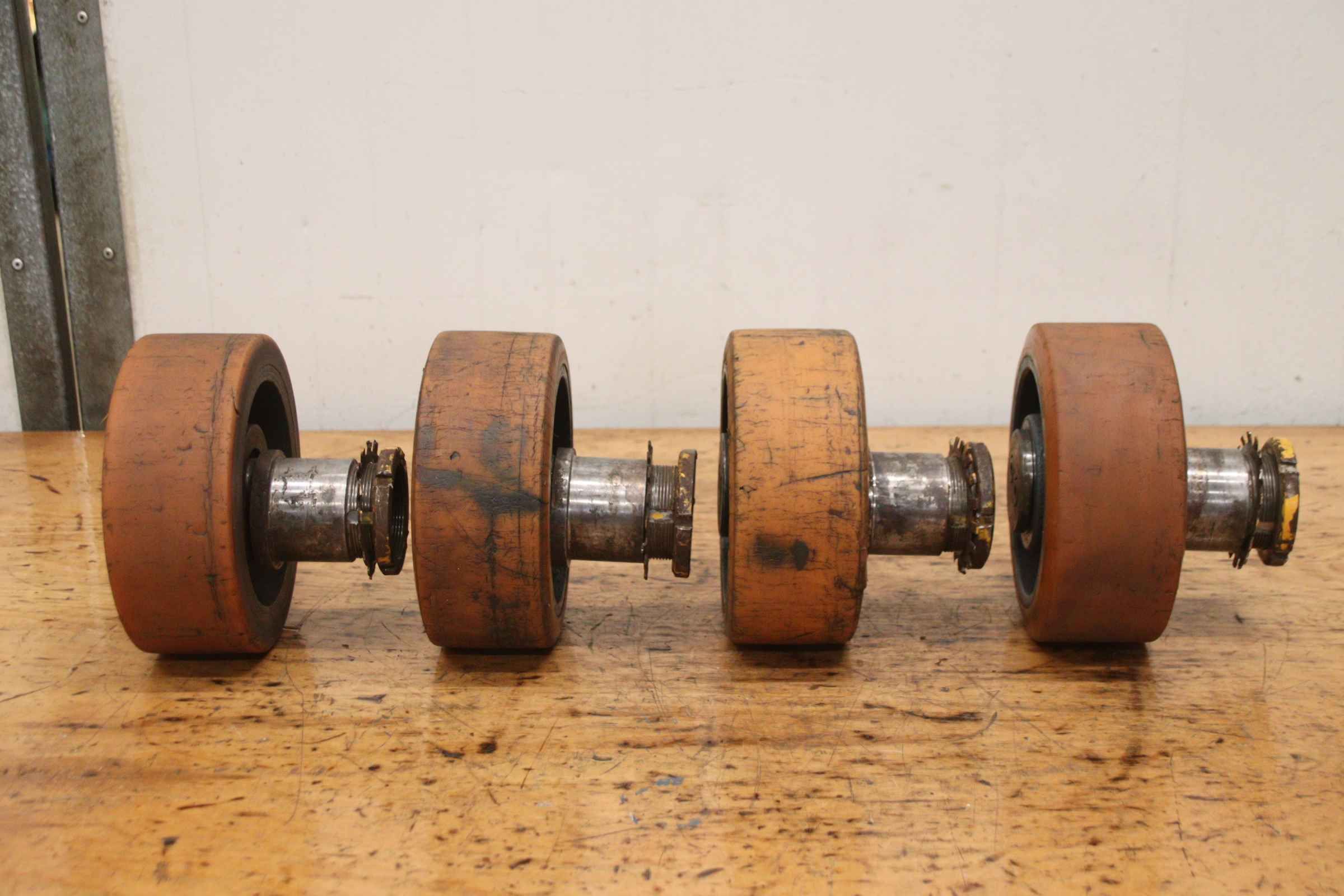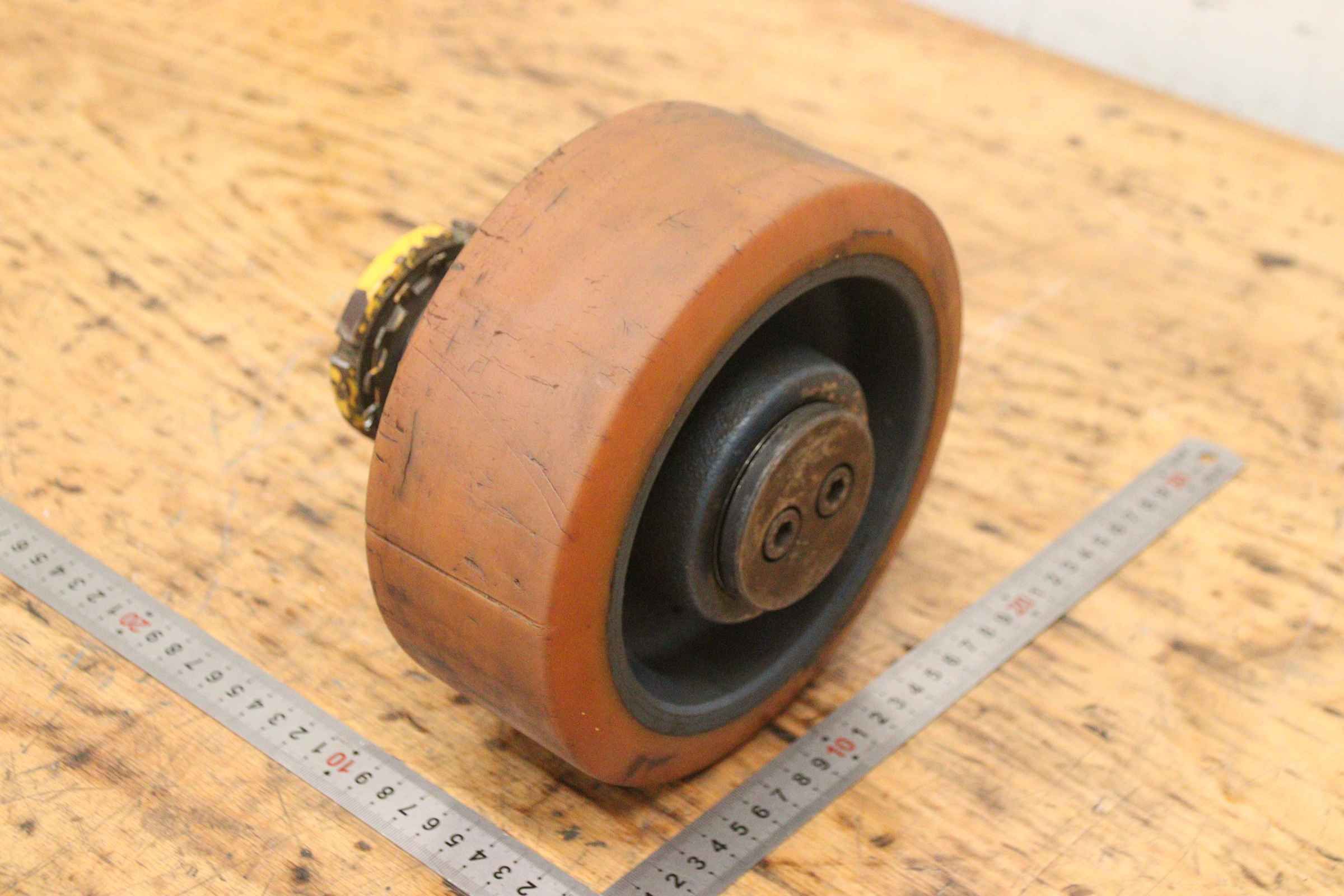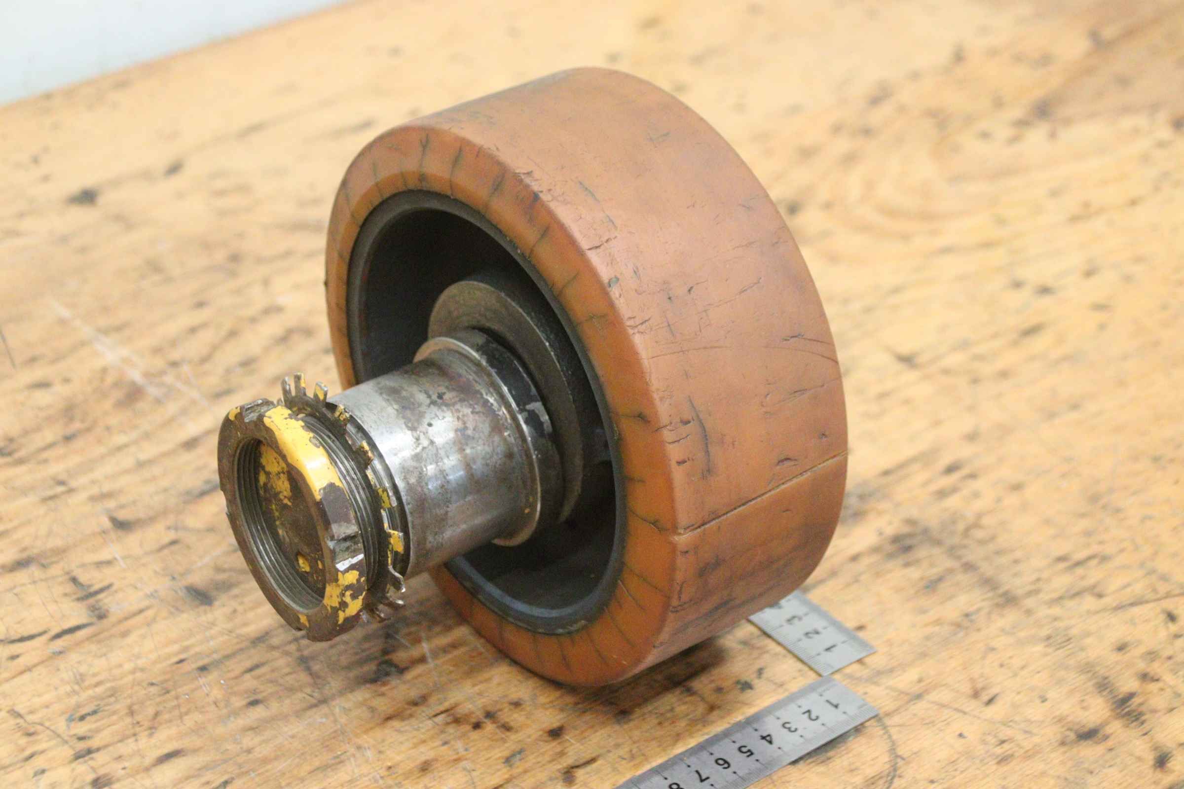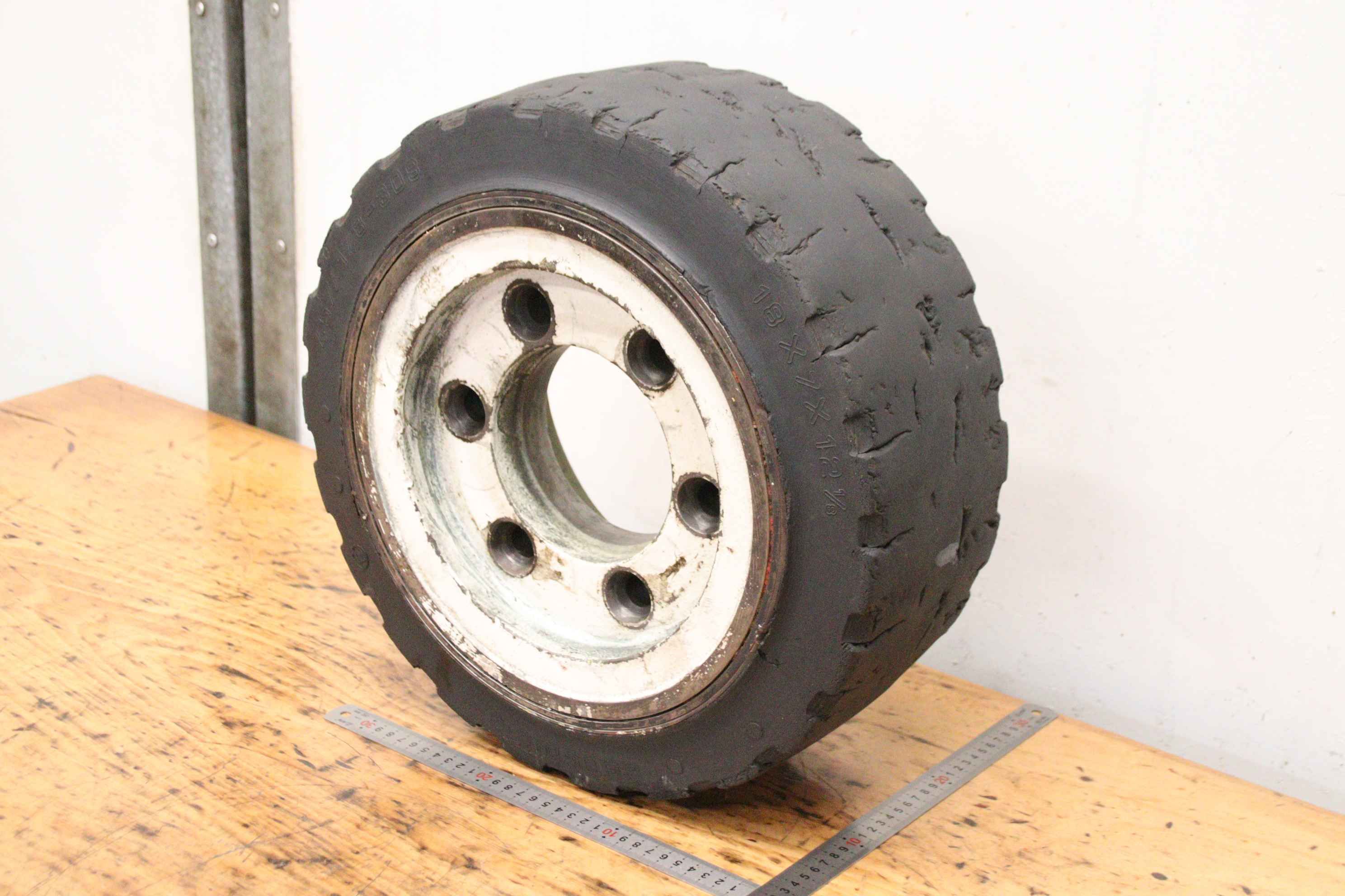 Schwerlastrollen, Schwerlastrad, Reifen, Reifen mit Felge, Schwerlastreifen, Staplerreifen-Schwerlastrollen: 4 Stück, aus Elektro-Stapler -Reifen: Ø 200 x 80 mm-Nabe: Ø 65 x 45 mm / Maße siehe Fotos-Abgabe/Preis: komplett-Abmessungen jew.: Ø 200 x 170 mm-Gewicht: 10,5 kg/Stück