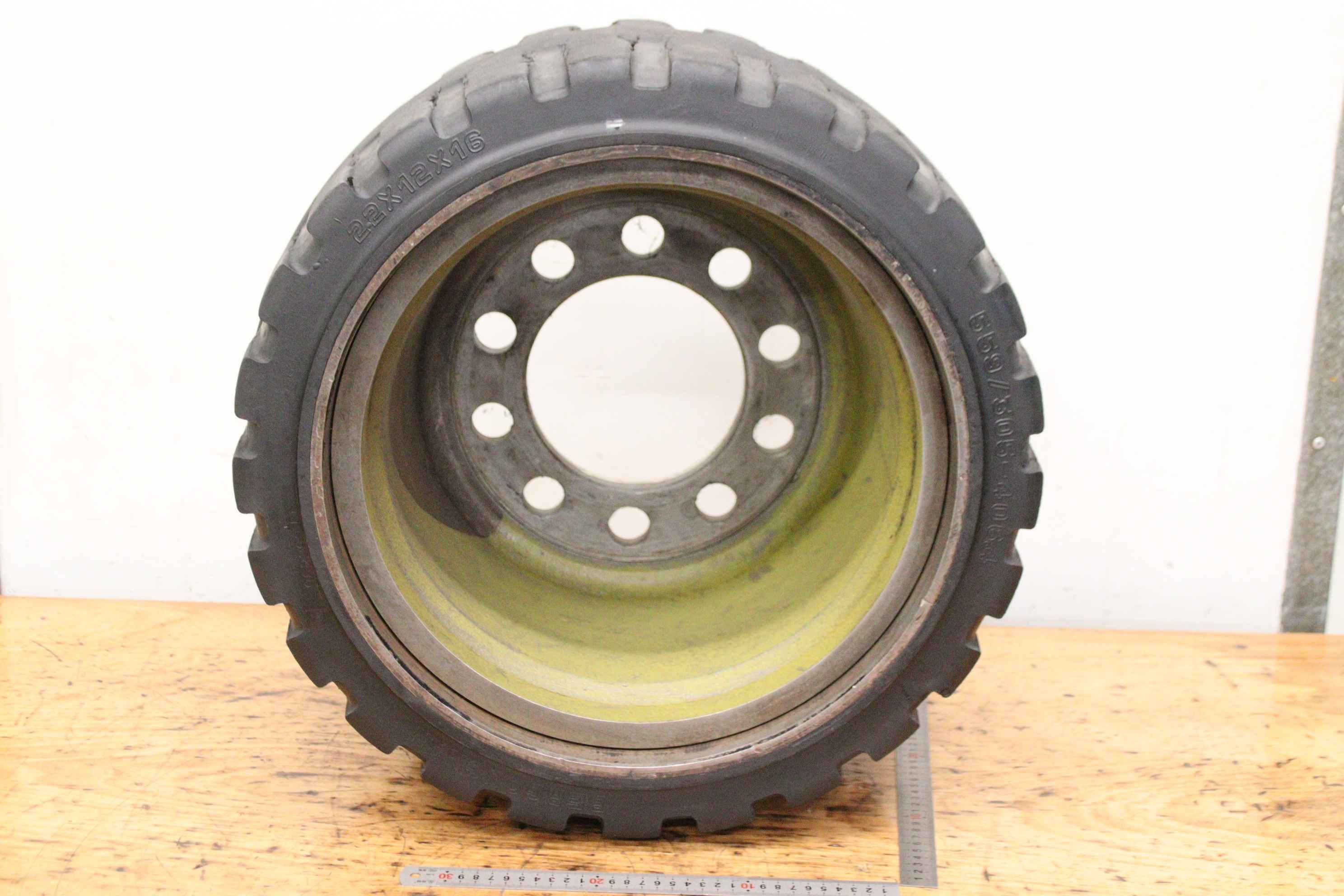 Reifen, Vollgummireifen, Staplerreifen, Komplettrad-Hersteller: Bergougnan, Vollgummmireifen mit Felge-Reifengröße: 22x12x16 -Lochkreis: Ø 220 x 31 mm-Rezess: Ø 160 mm-Felge: Maße siehe Fotos-Anzahl: 2x Reifen vorhanden-Preis: pro Stück-Abmessung: Ø 530 x 305 mm-Gewicht: 149 kg/St.