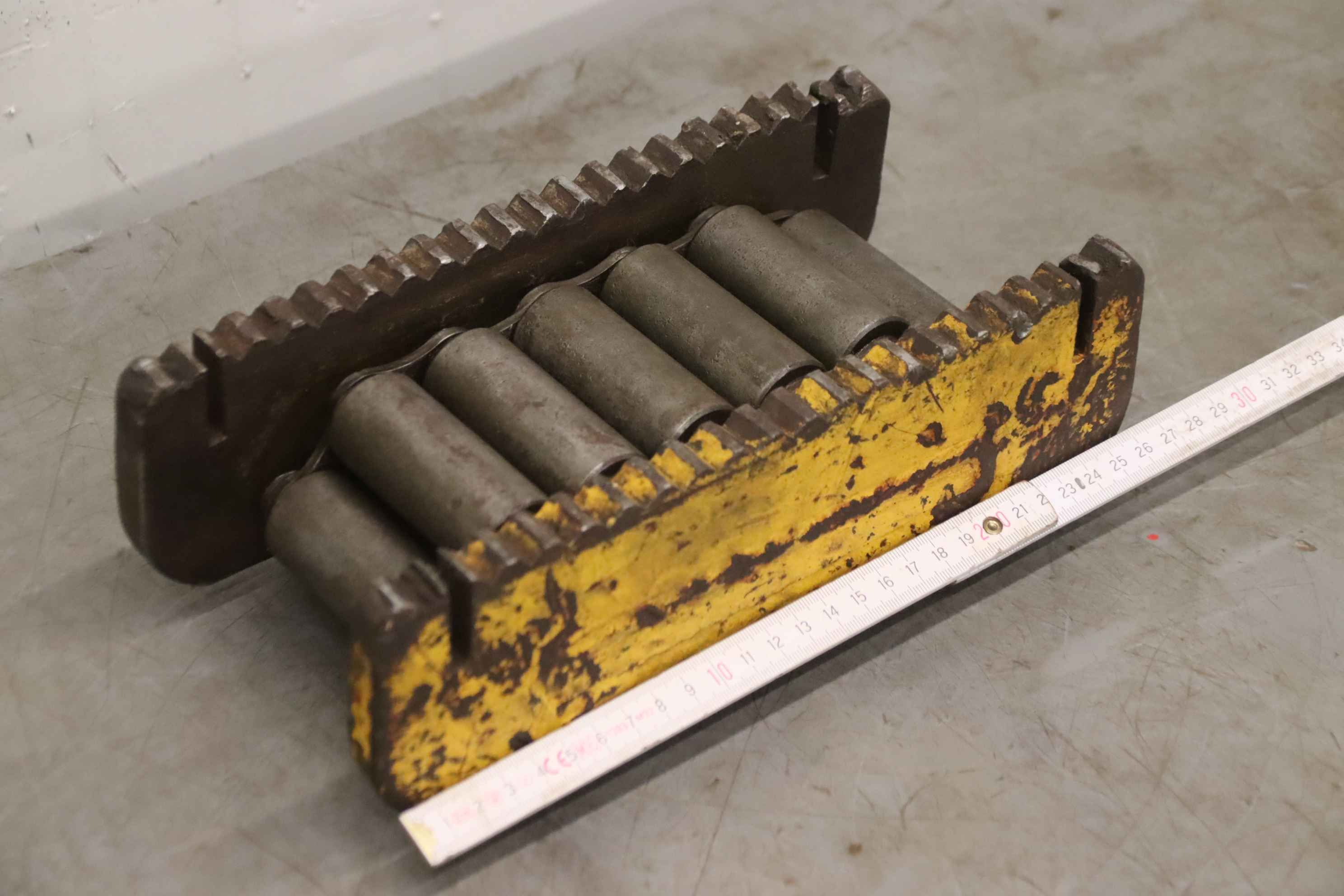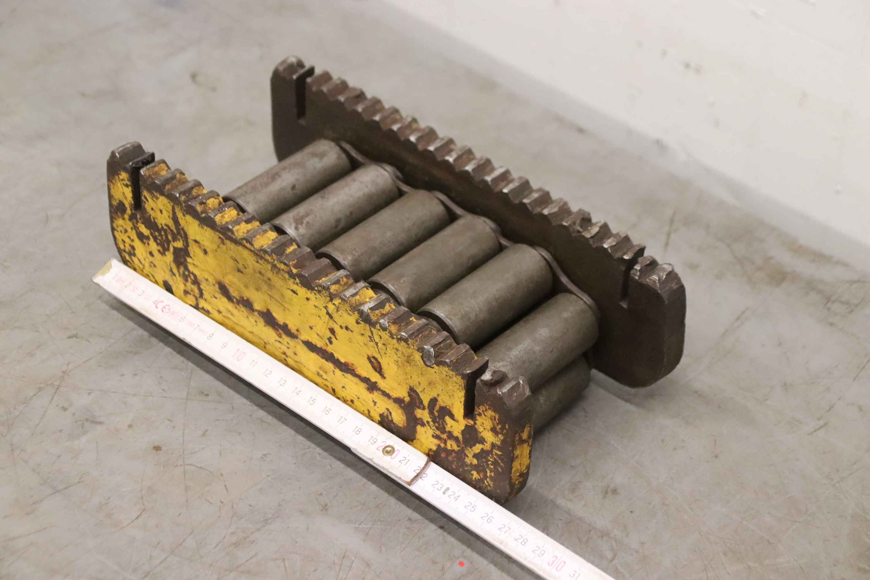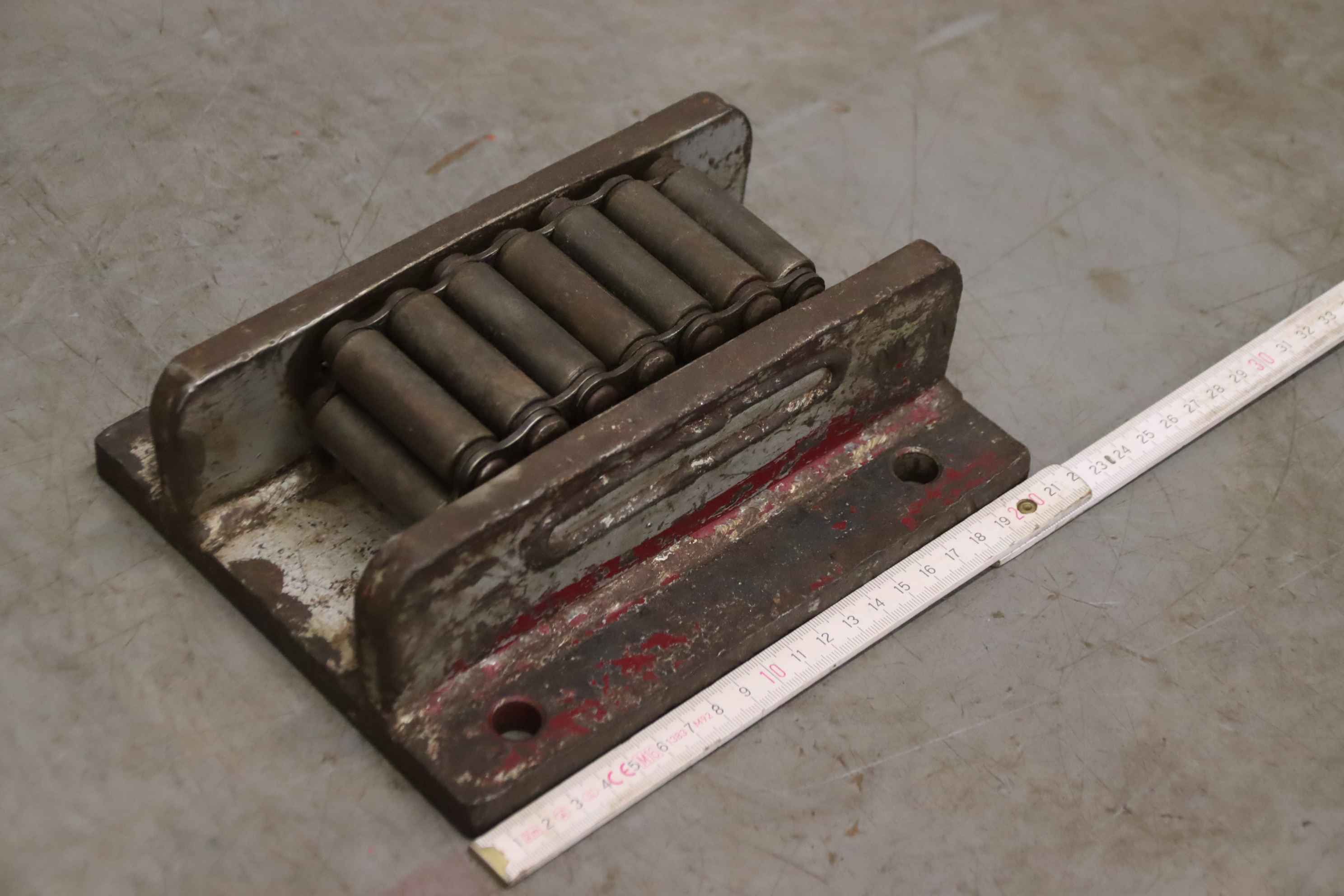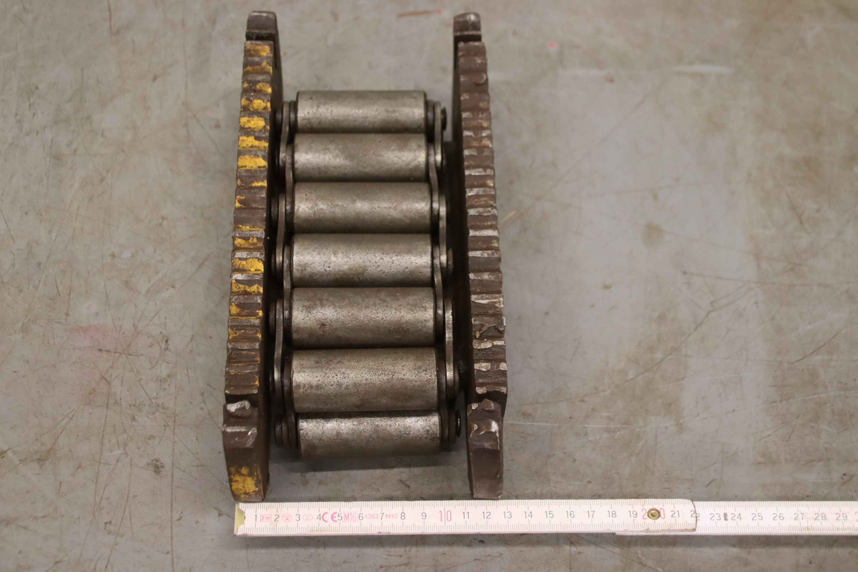 Einfach-Rollenkette, RollenketteNSM MAGNETTECHNIK GmbH 10x10Gesamtlänge ca. 7,352 m in zwei TeilstückenKettenteilung: 15,8 mmProfil: SimplexRollendurchmesser: 10,0 mmInnere Breite: 10,0 mm Bolzenlänge: 18 / 36 mmKettenbolzen-Durchmesser: Ø 5,1 mmLaschenhöhe: 17,2 mmLaschendicke: 1,7 mmWerkstoff: StahlNeu !Abmessungen ( Verpackung ): 270 x 260 x 60 mm