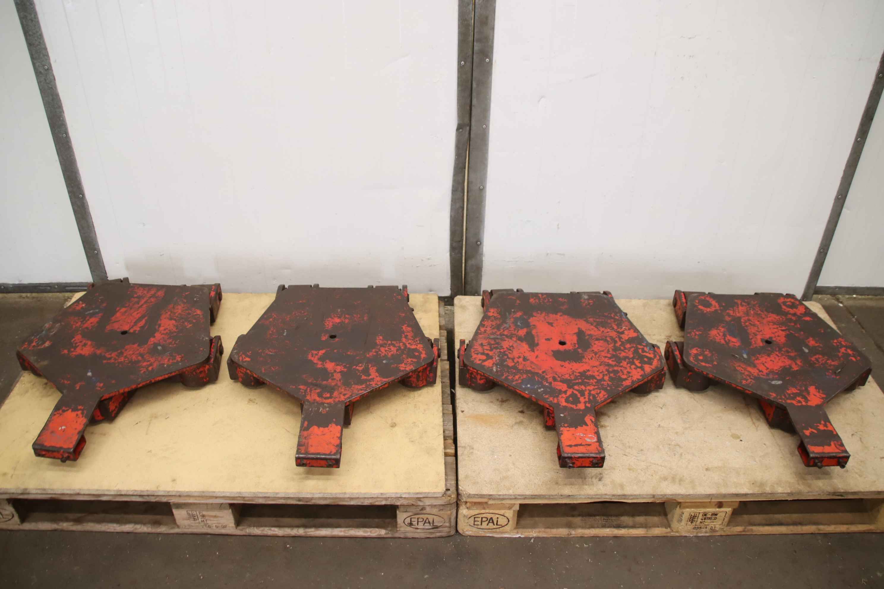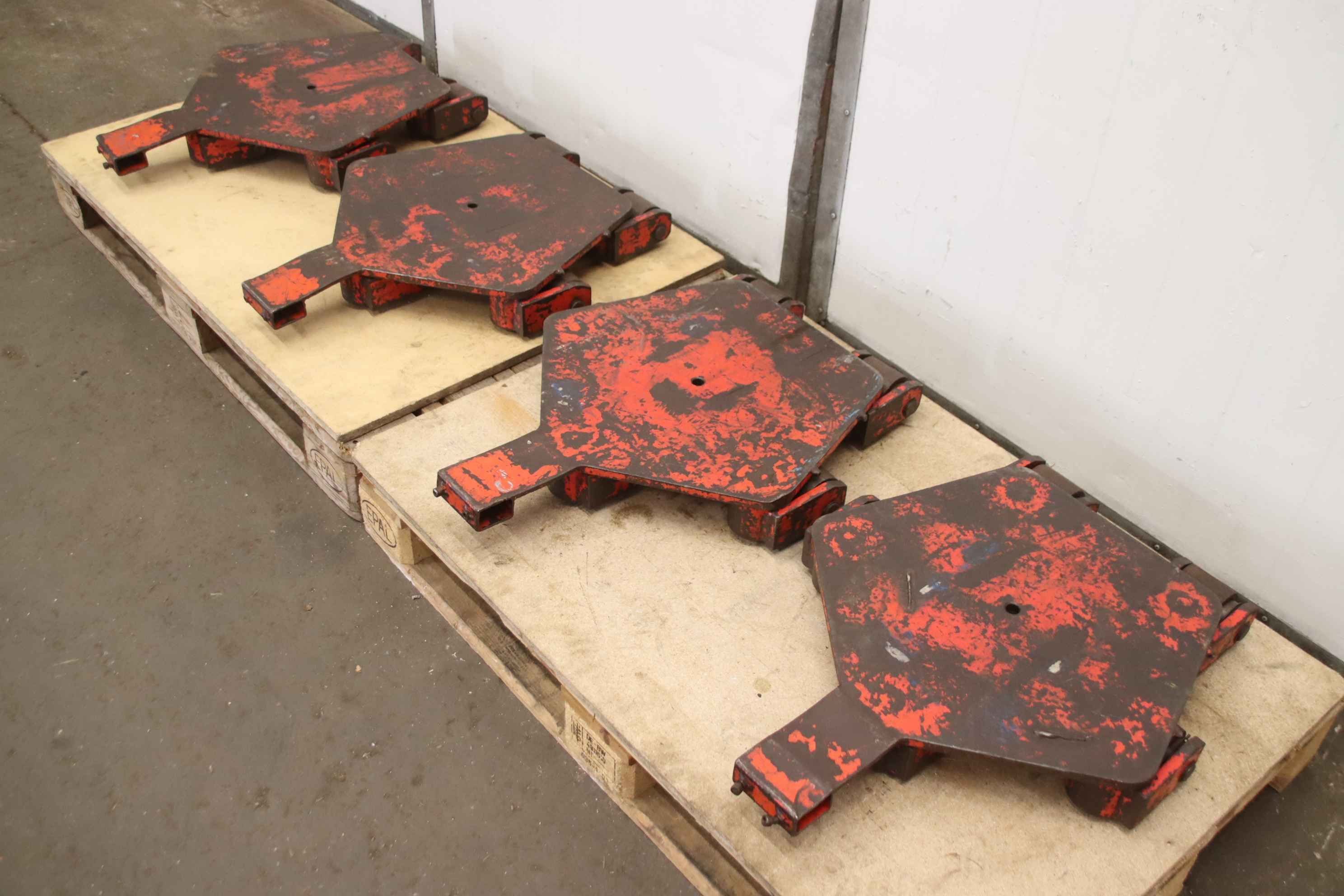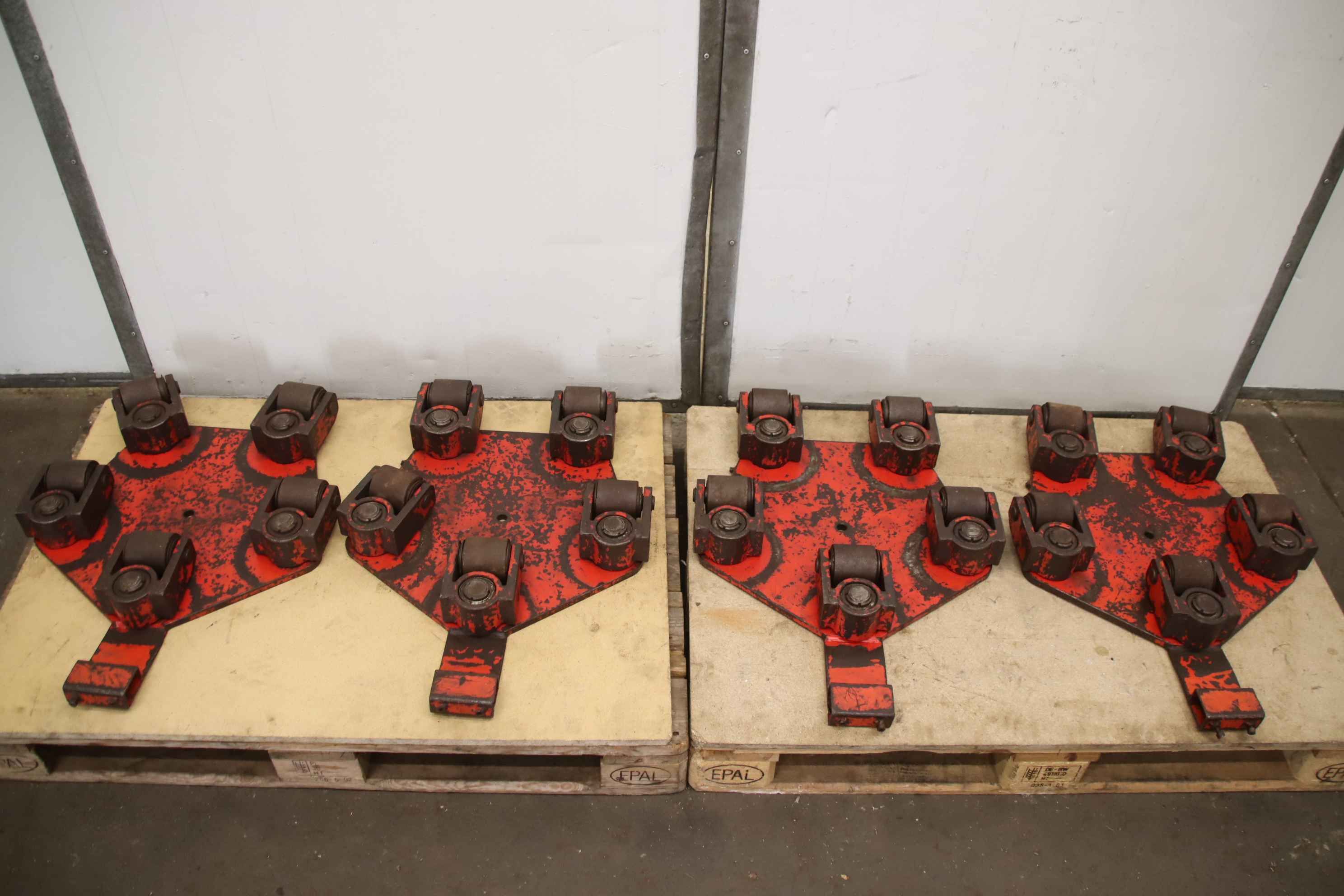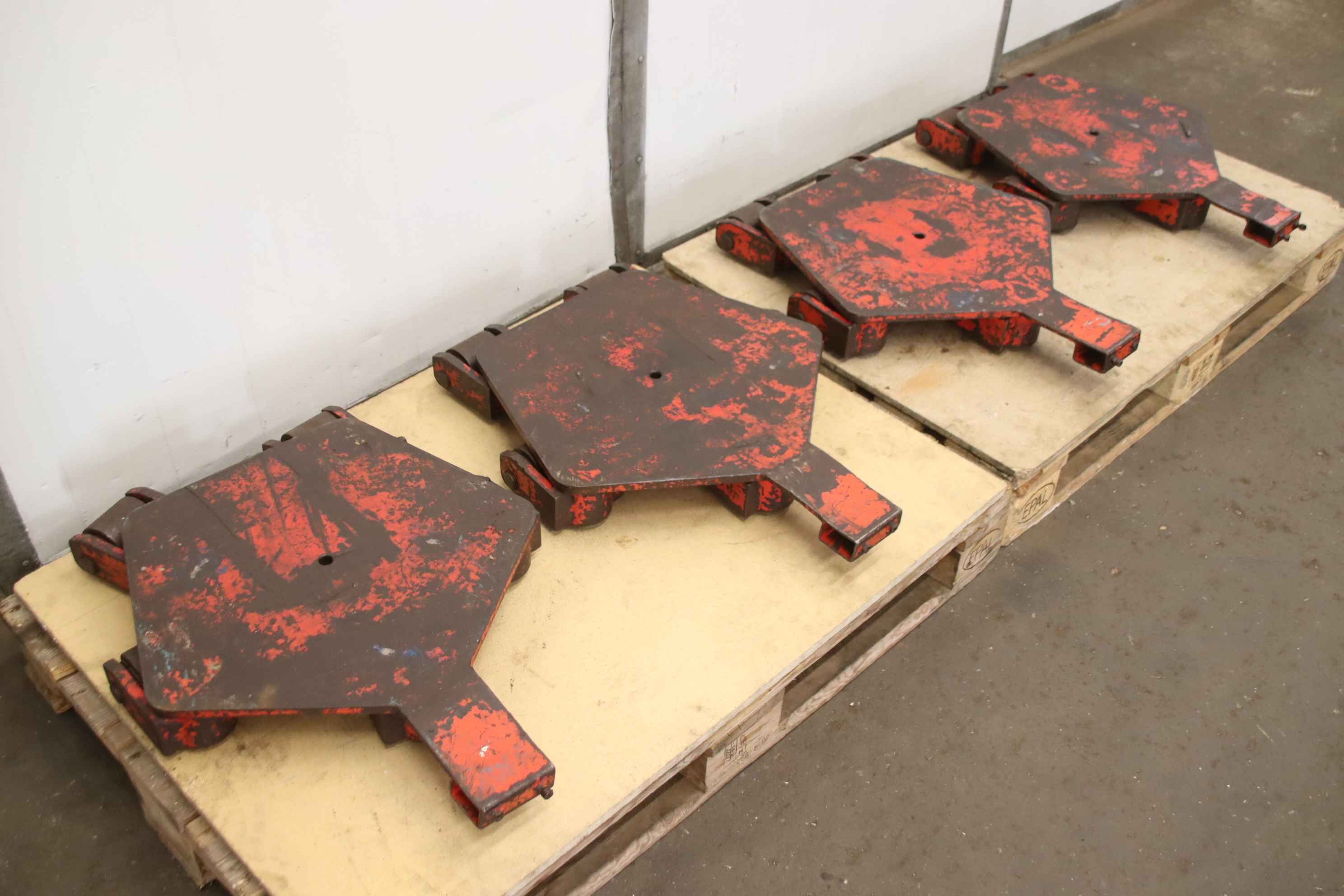 Schwerlast-Transportrollen, Maschinenrollen, Transportwagen, Schwerlastwagen, Panzerrollen, Maschinen-Transportrollen Lenkwerk-Maschinen-Transportrollen: Transportfahrwerk 4 Stück-Traglast: t -Rollen: Ø 77 x 70 mm-Abgabe/Preis: komplett-Lenkwerk: im Lagerbestand, kann gegen Mehrpreis mitgeliefert werden siehe ID 35935-Abmessung jew.: 655/560/H95 mm-Gewicht: 59 kg/St.
