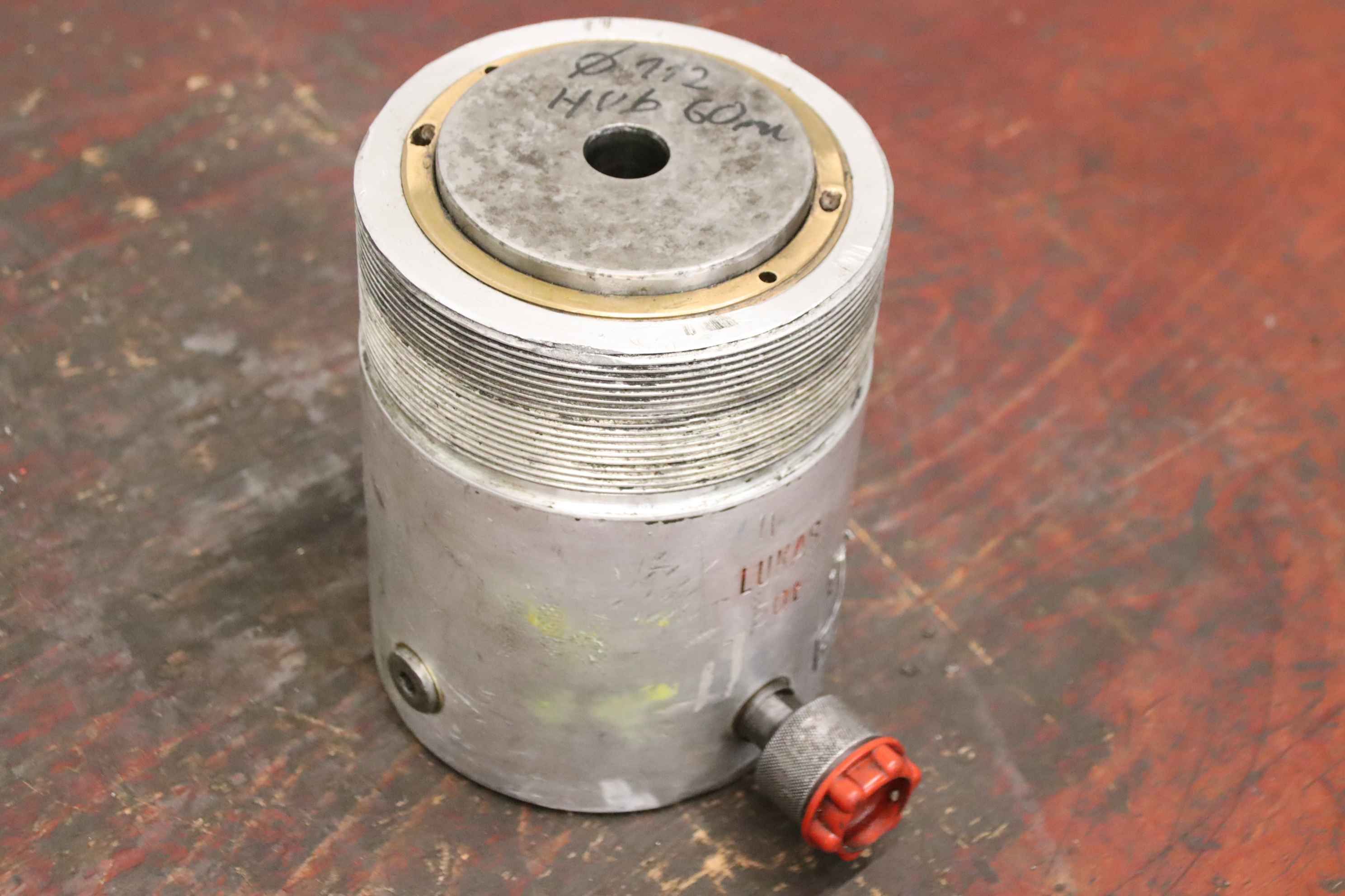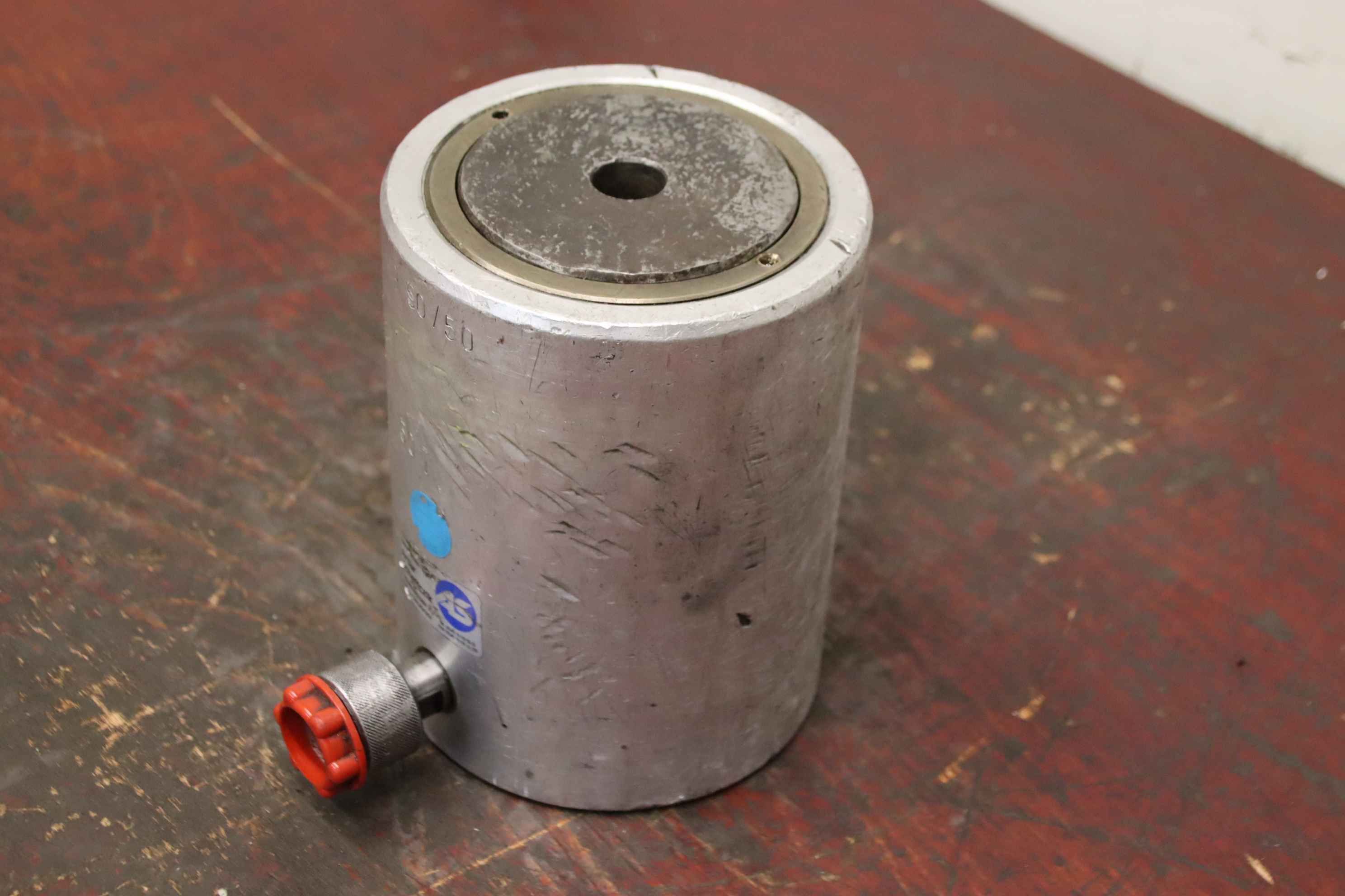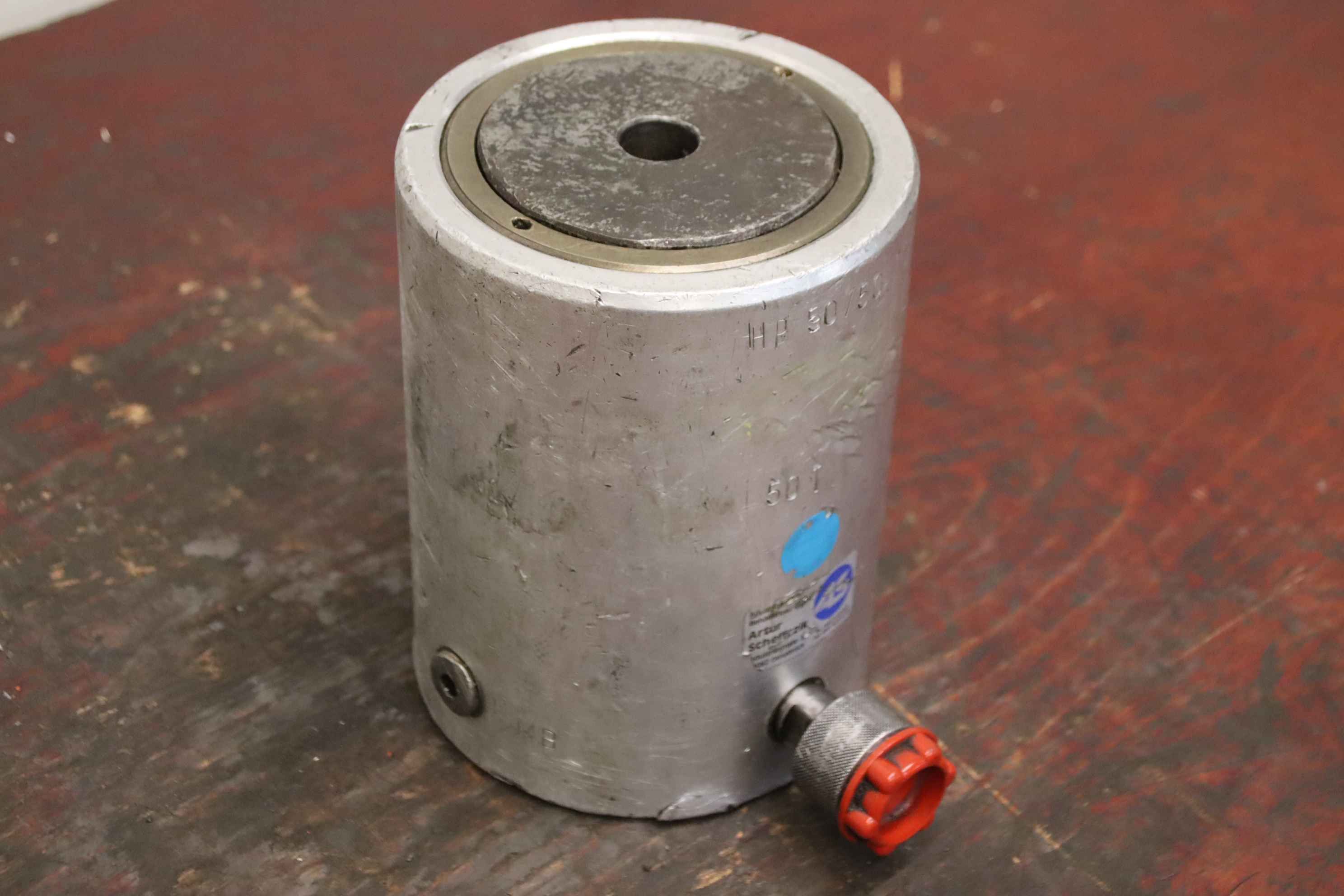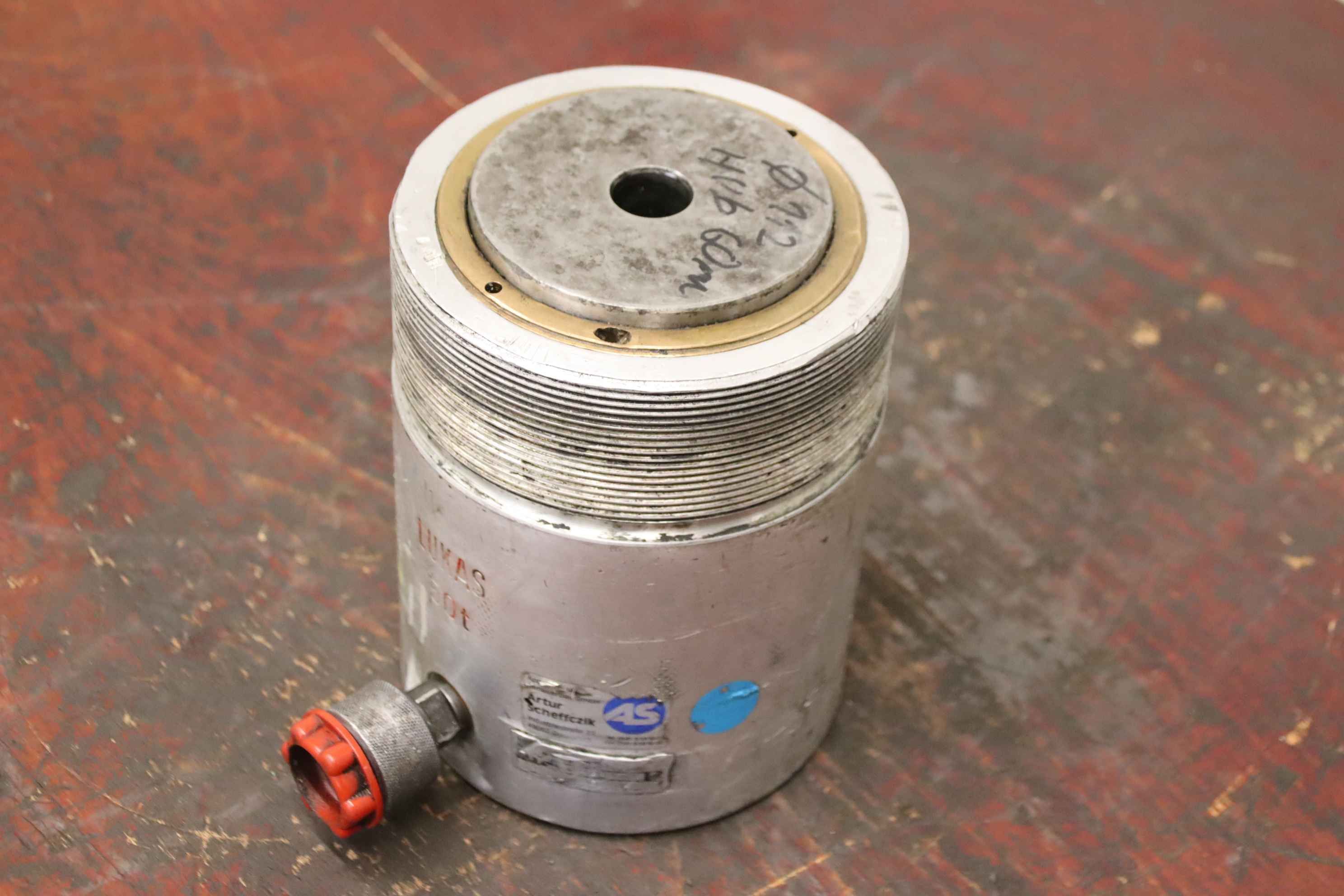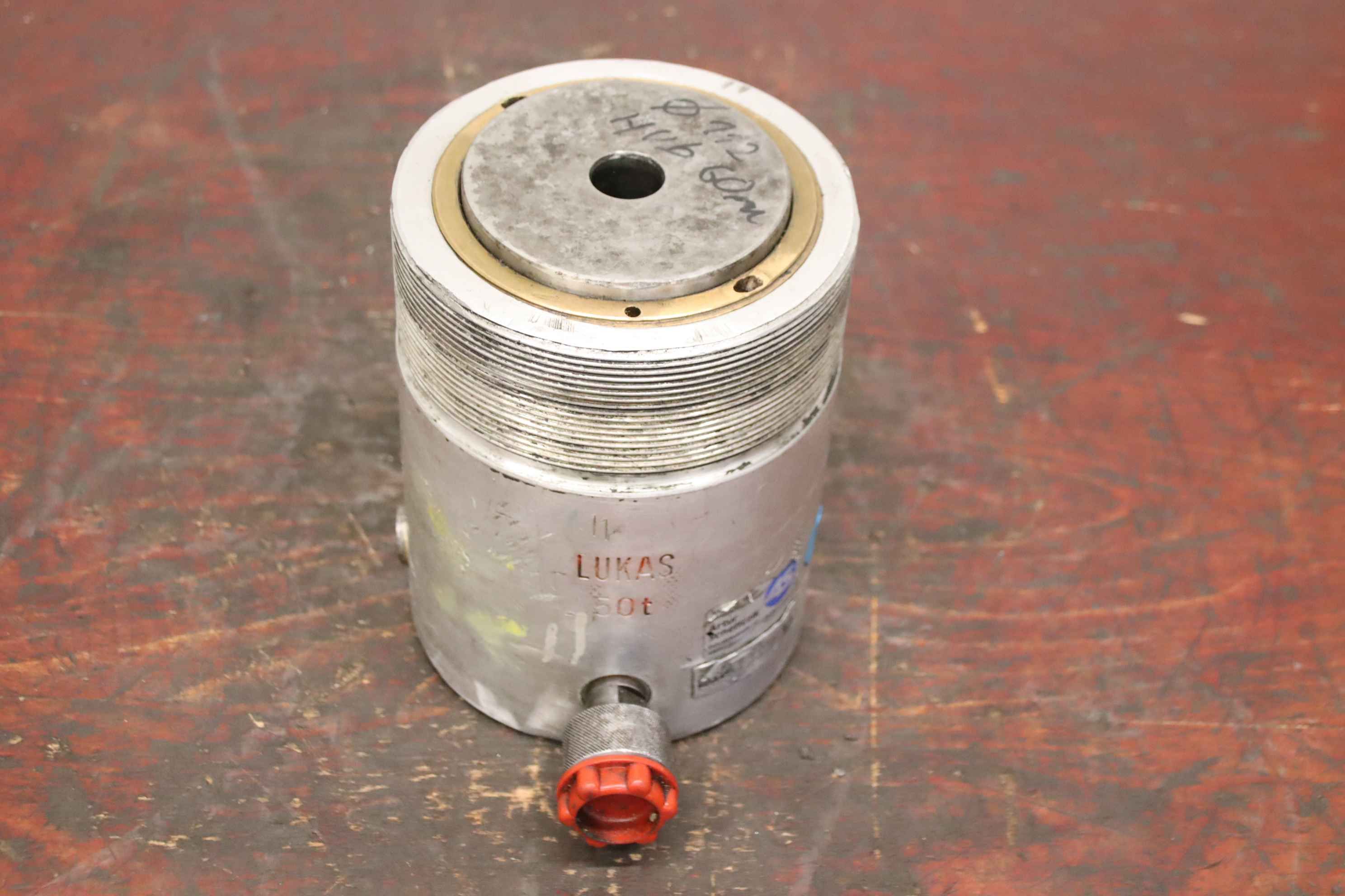 Hydraulikzylinder, Stützzylinder, Hydraulikstempel, Druckstempel-Hersteller: Lukas, einfachwirkender Leichtmetallzylinder mit Federrückzug Hub 50 mm-Typbezeichnung: HP 50/50-Stempeldurchmesser: 110 mm-Hubkraft: 50 t-Abmessungen: 220/165/H220 mm-Gewicht: 19,5 kg