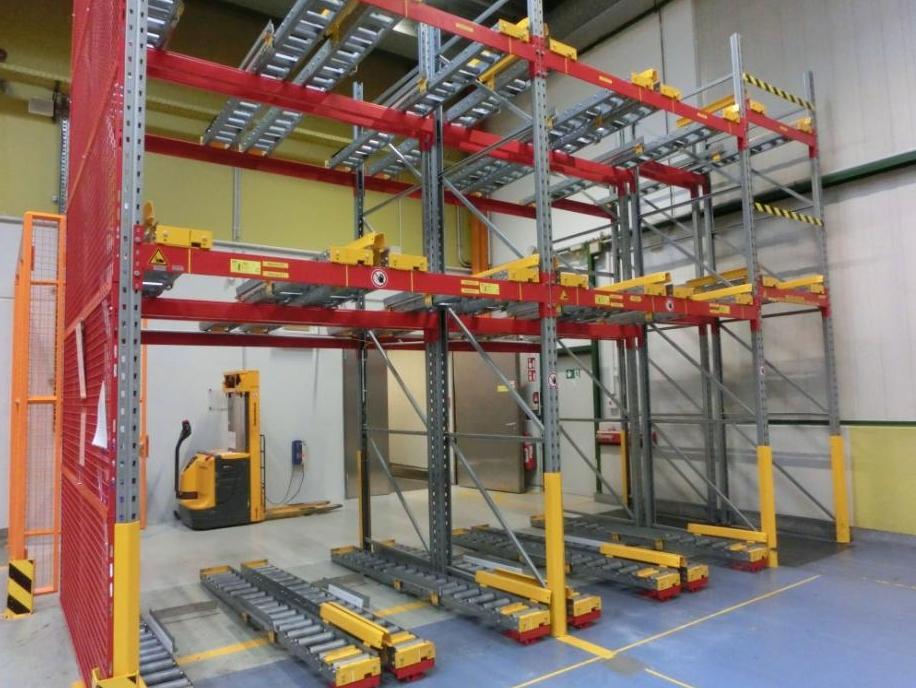 Paletten-DurchlaufregalBITO Gebindegröße: 800 bis 1000 x 1200 x 1200 mmFeldbreite:2400/1200 mmPalettengewicht: 50 bis 500 kgKanaltiefe 2700 mmMaße (LxTxH): 6400 x 2700 x 4750 mmInklusiv 2 Seitengittergebraucht, geprüft !