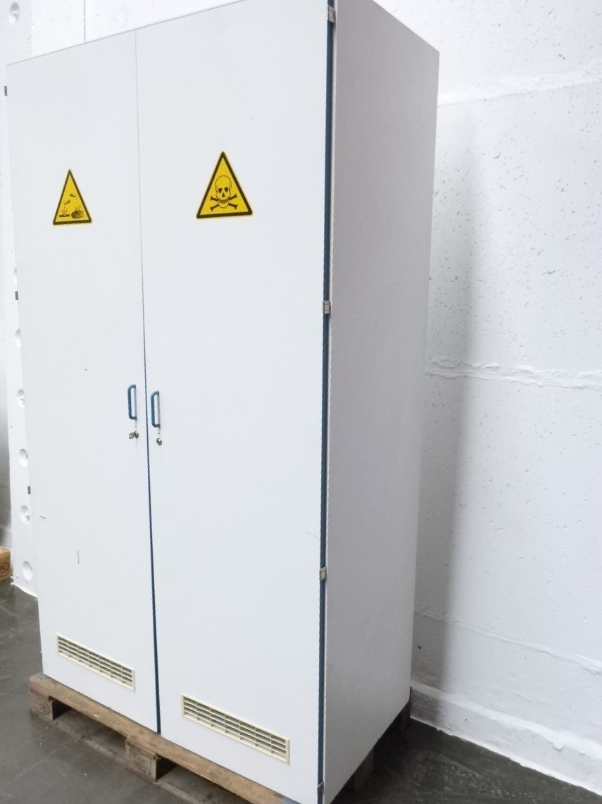 Cemikalienschrank mit SchließfachPAGUS1200 x 600 x 2125 mmInnenmaß: 2x 480 x 570 x 2090 mm ( Breite x Tiefe x Höhe ) 9x Fachboden: 480 x 570 mm ( höhenverstellbar )2x Tür: 590 x 2110 mmSchließfach ( Innenmaß ): 330 x 310 x 360 mm ( Breite x Tiefe x Höhe )mit Fachboden: 330 x 270 mm ( höhenverstellbar )vorbereitet zum Anschluss an ein Abluftsystem (DN 75), zwei Anschlüsse im Dachbereichverschließbar, 1x Schlüssel Schließfach, 1x Schlüssel linke Tür, ohne Schlüssel rechte Tür !gebraucht, geprüft !Abmessungen: 1200 x 660 x 2140 mm