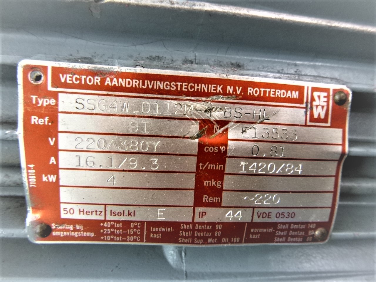 Getriebemotor mit BremseSEW, VECTOR ANTRIEBSTECHNIK ROTTERDAMSSG4W D112M-4-BS-HL ( SSG4WD112M-4-BS-HL )4,0 kW84 U/min220 / 380 V 3ACIP44Wellendurchmesser: Ø 45 mmWellenlänge: 90 mmNutbreite: 14 mmMotorfuß 1: 185 x 185 mmLochabstand ( parallel zur Welle ): 150 mmLochabstand ( quer zur Welle ): 135 mmMotorfuß 2: 185 x 215 mmLochabstand ( parallel zur Welle ): 150 mmLochabstand ( quer zur Welle ): 135 mmLochdurchmesser: Ø 18 mmNeu ! Abmessungen: 700 x 290 x 290 mm