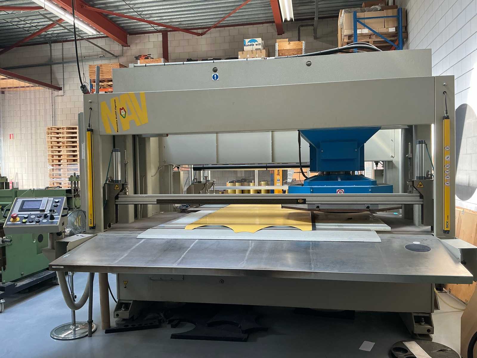 Tischbreite 1850 mm Tischgröße: 1200 mm Verfügt über einen drehbaren Kopf mit den Maßen 1000x1000 mm, elektronische Steuerbox, angeschlossen an den Kompressor (nicht enthalten), 3 Greifer darunter 1 Materialtransportgreifer. Anpassbare Maschine. Er hatte jährliche Wartung. Für die Besichtigung am Tag nach Vereinbarung, melden Sie sich an unter: l.vandenhoven@troostwijkauctions.com