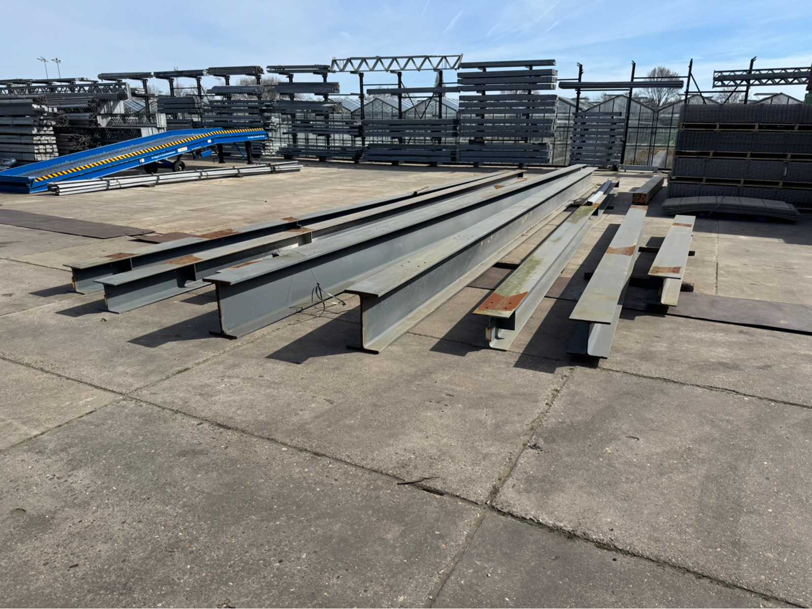 2 Stück IPE 500 mit einer Länge von ca. 15.000 mm; die übrigen Balken haben die gleiche Größe ca. 300 mm x 300 mm; 6 Längen mit insgesamt verschiedenen Längen, die längste Länge beträgt ca. 15.000 mm; und die kürzeste Länge beträgt etwa 4600 mm
