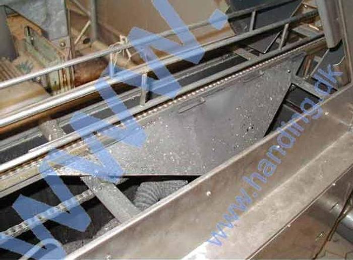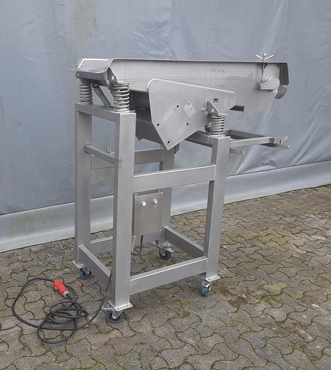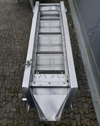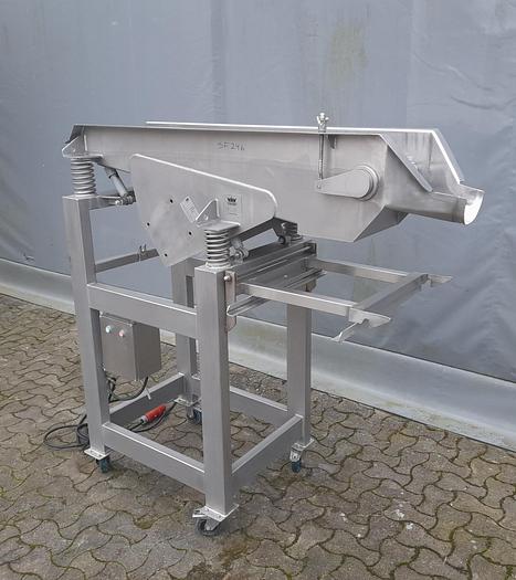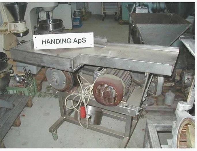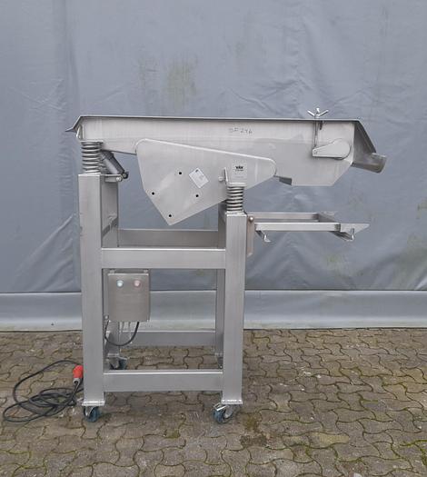 Best.-Nr.: SF246, Material: Edelstahl AISI 304, Artikel: Vibrationssieb, Auf Lager: Ja, Menge auf Lager: 1 Stk., Stehend: 4 Stk. Beine auf Rädern, Gesamthöhe: 1590 mm., Fraktionen: 2 Stk., Maße: L 1590 x B 600 x H 1540 mm., Hersteller: VÅV Scan-Vibro, Baujahr: 1997, Sonstiges: exkl. Vibrationsmotor