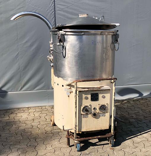 50 Liter, Best.-Nr.: T3240, Liter 1: 20, Liter 2: 50, Material: Edelstahl AISI 304, Auf Lager: Ja, Menge auf Lager: 1 Stk., Artikel: Kippbarer Kessel, Stehend: Auf Gestell mit Rädern, Oben: Offen mit Deckeln, Motor: 9,6 kW - 3 x 380 Volt, Innendurchmesser: G1: 380 mm. G2: 480 mm., Maße: L 1800 x B 700 x H 1080 mm., Hersteller: A. Wilson, Sonstiges: Elektrisch beheizt