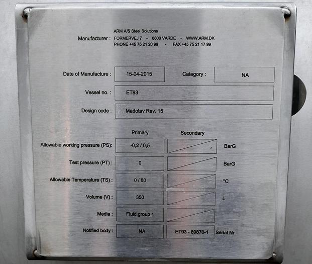 350 Liter, Best.-Nr.: T3910, Liter: 350, Material: Edelstahl AISI 304, Auf Lager: Ja, Menge auf Lager: 1 Stk., Artikel: Tank, Liegend: 4 Stk. Beine, Endböden: Dished, Arbeitstemperatur: 0/80 C, Arbeitsdruck: -0,2/0,5 BarG, Innendurchmesser: 550 mm., Gesamtlänge: 1900 mm., Hersteller: ARM A/S Steel Solutions, Jahr: 2015