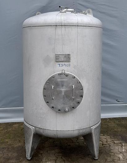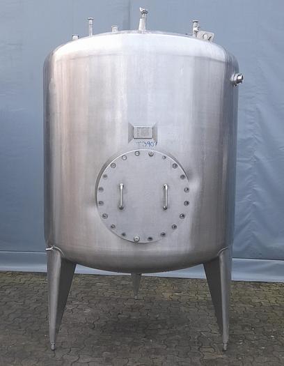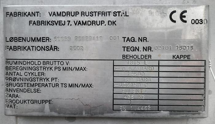 1.875 Liter, Best.-Nr.: T3909, Liter: 1.875, Material: Edelstahl AISI 316, Auf Lager: Ja, Menge auf Lager: 1 Stk., Artikel: Druckbehälter, Stehend: 3 Stk. Beine , Oben: Unten: Unten: Verzinkt, Tankabdeckung: Seitlich, 360 mm., CIP: Oben Mitte, Arbeitstemperatur: -10/150 C, Arbeitsdruck: 7,2 bar, Innendurchmesser: 1200 mm., Gesamthöhe: 2150 mm., Hersteller: Vamdrup Rustfrit Stål, Baujahr: 2002, Sonstiges: Der Tank ist auf der Innenseite poliert und wurde zuvor für den Druck verwendet.