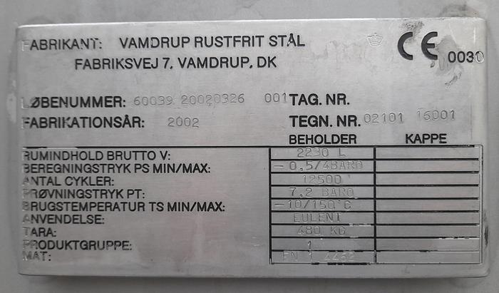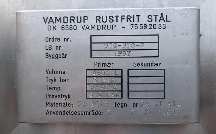 4.600 Liter, Best.-Nr.: T3907, Liter: 4.600, Material: Rostfreier säurebeständiger Stahl SS 2377, Auf Lager: Ja, Menge auf Lager: 1 Stk., Artikel: Druckbehälter, Stehend: 3 Stk. Beine , Oben: Unten: Unten: Verzinkt, Tankabdeckung: Seitlich, 500 mm., Arbeitstemperatur: 5-40 C, Arbeitsdruckbehälter: 3 bar, Innendurchmesser: 1750 mm., Gesamthöhe: 2700 mm., Hersteller: Vamdrup Rustfrit Stål, Baujahr: 1997, Sonstiges: Der Tank ist innen poliert und wurde zuvor für den Druck verwendet.