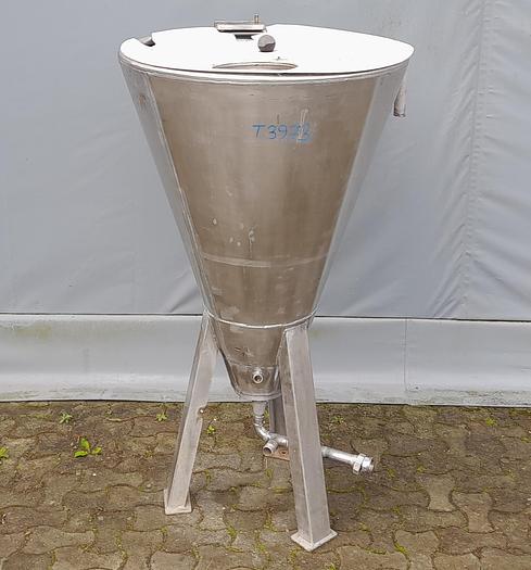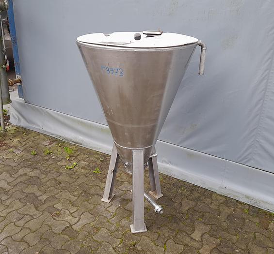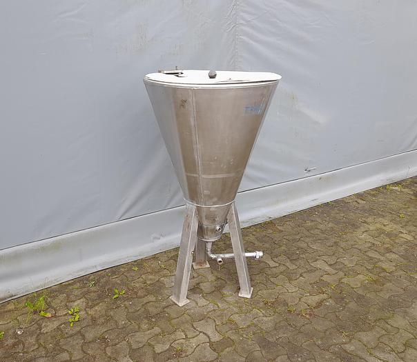 200 Liter, Best.-Nr.: T3973, Liter: 200 , Material: Edelstahl AISI 304, Auf Lager: Ja, Menge auf Lager: 1 Stk., Artikel: Trichter, Stehend: 3 Stk. Beine , Oben: Oben offen mit Deckel, CIP: Ring in der Oberseite, Innendurchmesser: 800 mm., Gesamthöhe: 1400 mm.