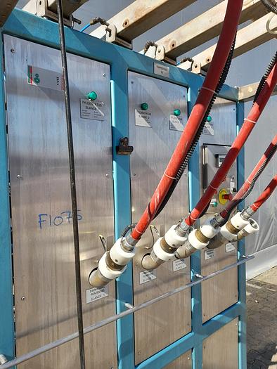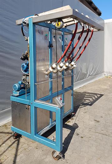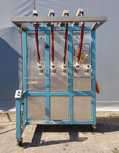 Best.-Nr.: F1075, Artikel: Abfüllmaschine, Auf Lager: Ja, Menge auf Lager: 1 Stk., Stehend: 4 Stk. Räder, Maße: L 1500 x B 1100 x H 2200 mm., Gesamthöhe: 2400 mm., Dosierung: 5-25 Liter, Füllköpfe: 4 Stk., Sonstiges: Mechanischer und elektronischer Zählmechanismus und inkl. druckluftbetriebenem Kapselverdichter