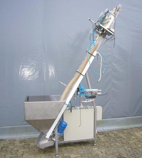 Best.-Nr.: D1032, Kapselzuführung, Edelstahl, Elevator ohne Sortierung und Kapselmagazin., Förderband mit Trägern B 200 mm., Höhe des Auslaufs 2800 mm., Kapselsilo 650 x 700 mm., Material: Edelstahl AISI 304, Abmessungen: H 2800 x L 1800 mm.