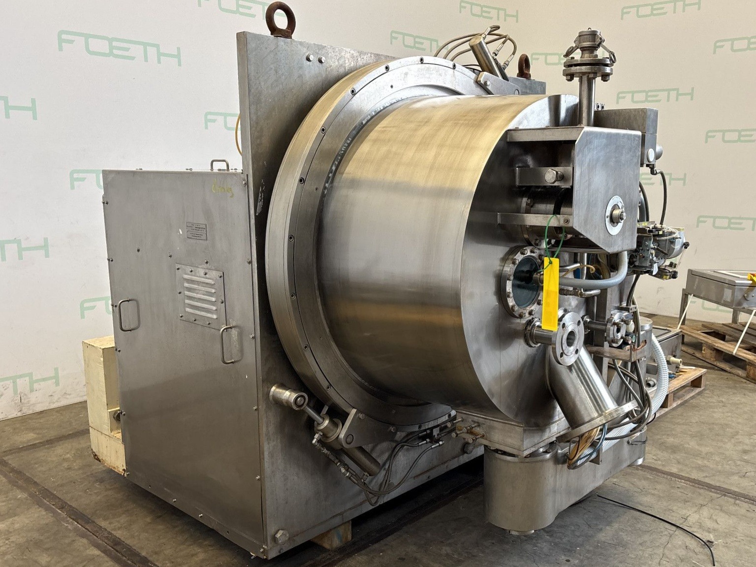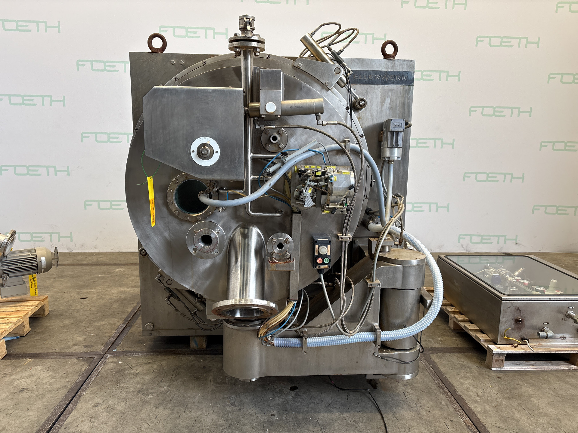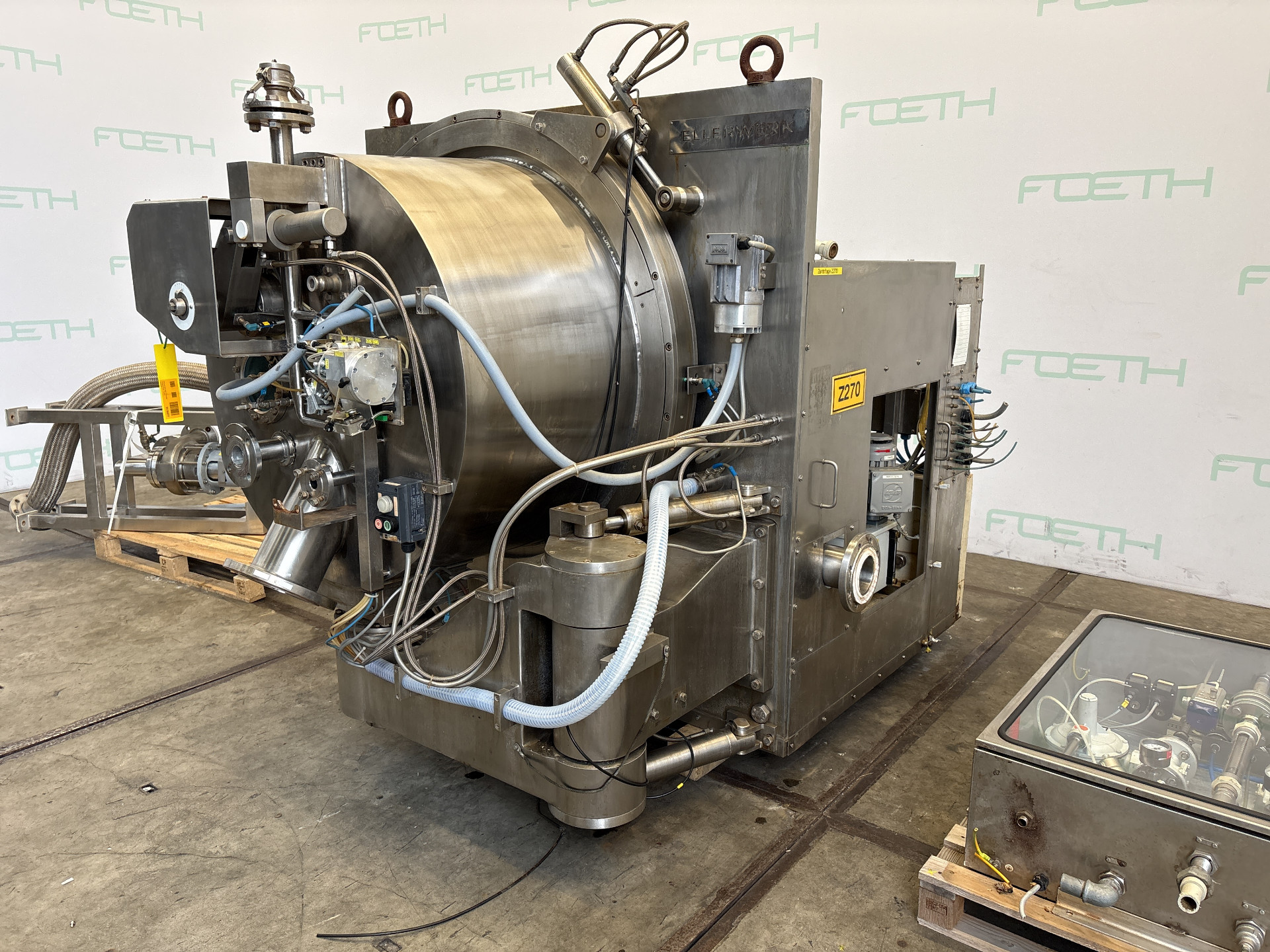 General SKU311X477 HerstellerEllerwerk Typ936H cGMP №02.059 Baujahr2002 StandortBarneveld Haupteigenschaften MaterialEdelstahl Motor18.5 KW Einlass durchm.50 mm Spezifizierte Eigenschaften - Schälzentrifuge Schälzentrifugecheck Inhalt96 l. Trommelabmessungenø 900 x 400 mm Wandstärke13 mm Max. Ladegewicht150 kg Motor18,5 kW, 380/400 volt, 1470 rpm Max. Trommeldrehzahl1600 rpm Mit Abstreifercheck Mit Hydraulikaggregatcheck Motor0,75 kW 380 V 1390 rpm EinlaufDN 80 FeststoffauslaufDN 150 FlüssigkeitsauslaufDN 100 MaterialEdelstahl 2.4605 (Legierung 59) Information Gebaut auf Grundplattecheck Platzbedarf2,37 x 1,85 m Totalhöhe2,90 m Gewicht7880 kg CEcheck  ...