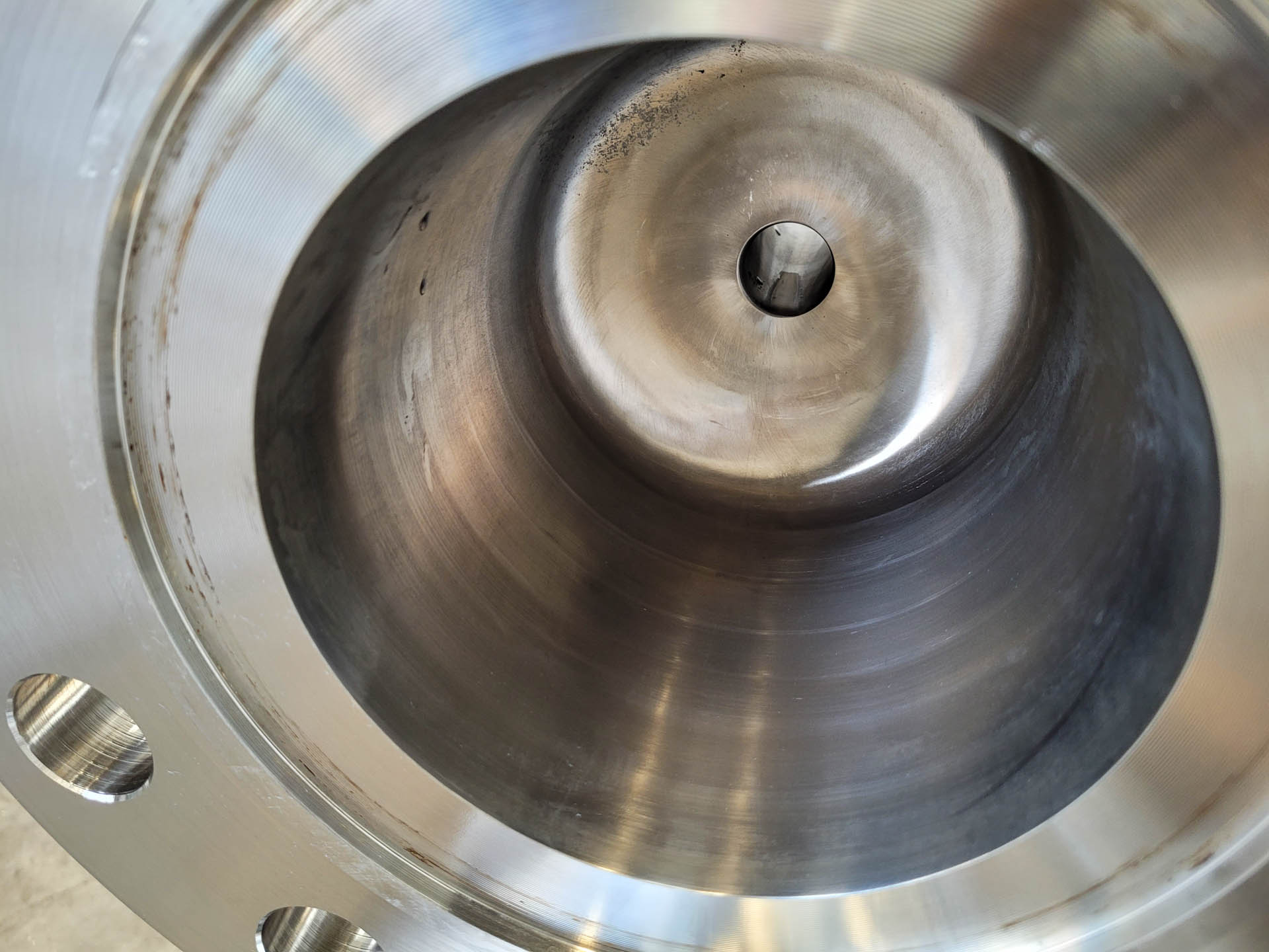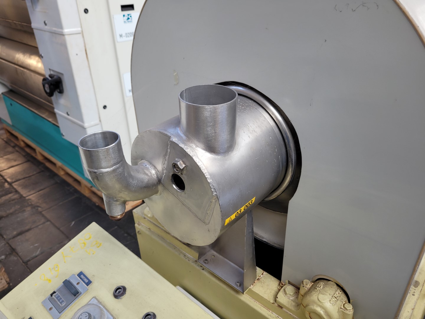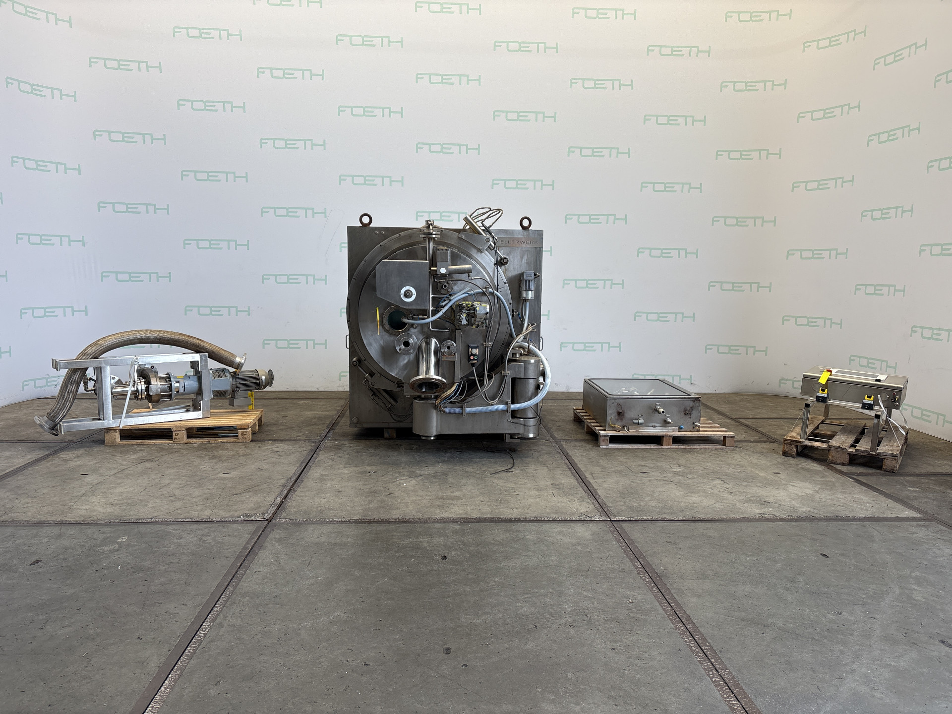 General SKU311X477 HerstellerEllerwerk Typ936H cGMP №02.059 Baujahr2002 StandortBarneveld Haupteigenschaften MaterialEdelstahl Motor18.5 KW Einlass durchm.50 mm Spezifizierte Eigenschaften - Schälzentrifuge Schälzentrifugecheck Inhalt96 l. Trommelabmessungenø 900 x 400 mm Wandstärke13 mm Max. Ladegewicht150 kg Motor18,5 kW, 380/400 volt, 1470 rpm Max. Trommeldrehzahl1600 rpm Mit Abstreifercheck Mit Hydraulikaggregatcheck Motor0,75 kW 380 V 1390 rpm EinlaufDN 80 FeststoffauslaufDN 150 FlüssigkeitsauslaufDN 100 MaterialEdelstahl 2.4605 (Legierung 59) Information Gebaut auf Grundplattecheck Platzbedarf2,37 x 1,85 m Totalhöhe2,90 m Gewicht7880 kg CEcheck  ...