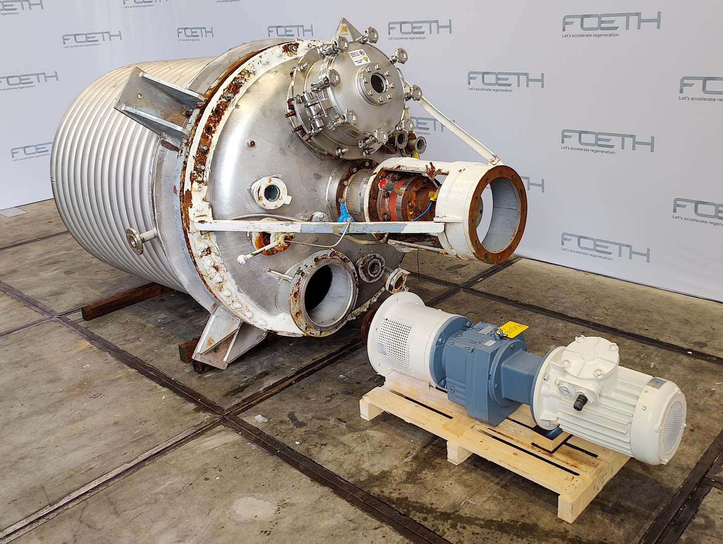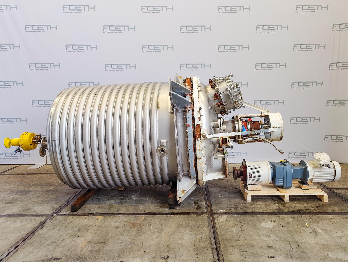 General SKU322W671 StandortBarneveld CEcheck HerstellerPfaudler TypBE-16000 Pressure Betriebsdruck6 Bar Vakuum möglichcheck Betriebsdruck Doppelmantel8 Bar Doppelmantel vakuum möglichcheck Haupteigenschaften MaterialGlas Inhalt16000 Ltr. Motor18.5 KW Spezifizierte Eigenschaften - Emaillierte Reaktor MaterialGlas - Emaille Glass Reactors Reaktorcheck Inhalt18200 L (netto 16000l) Kesselabmessungen⌀ 2542 x 4080 mm Klöpperbodencheck Klöpper Obenseitecheck Mannlochcheck DN600 ObenanschlüsseDN 300 (3x), DN200 (5x) AuslaufDN 150 Mit Doppelmantelcheck 1451 l Max. Temperatur-25/+200°C Mit Propellorrührwerkcheck (With Cryo lock) Motor18.5 kW, 400/600V, 1474rpm (E ...
