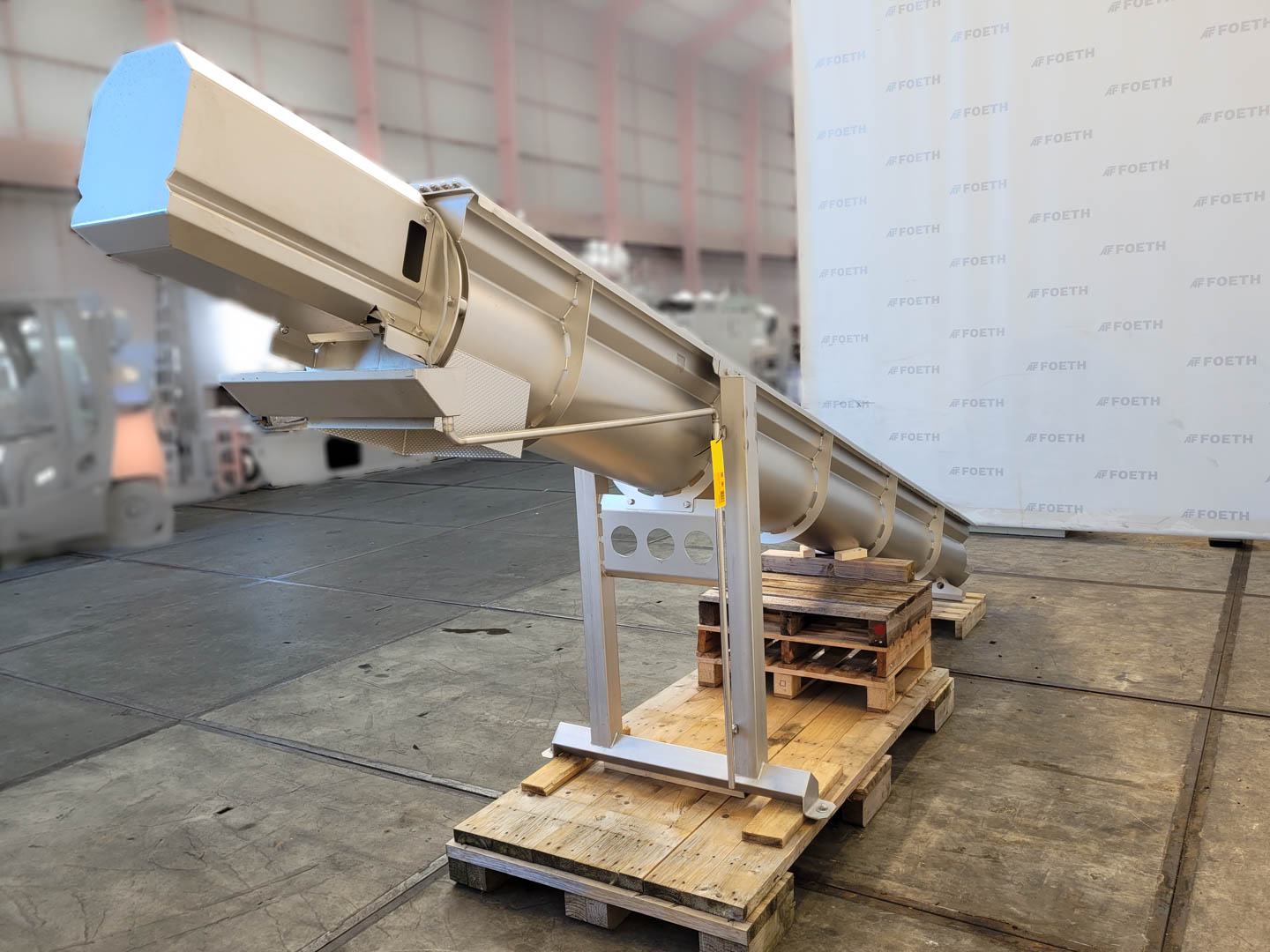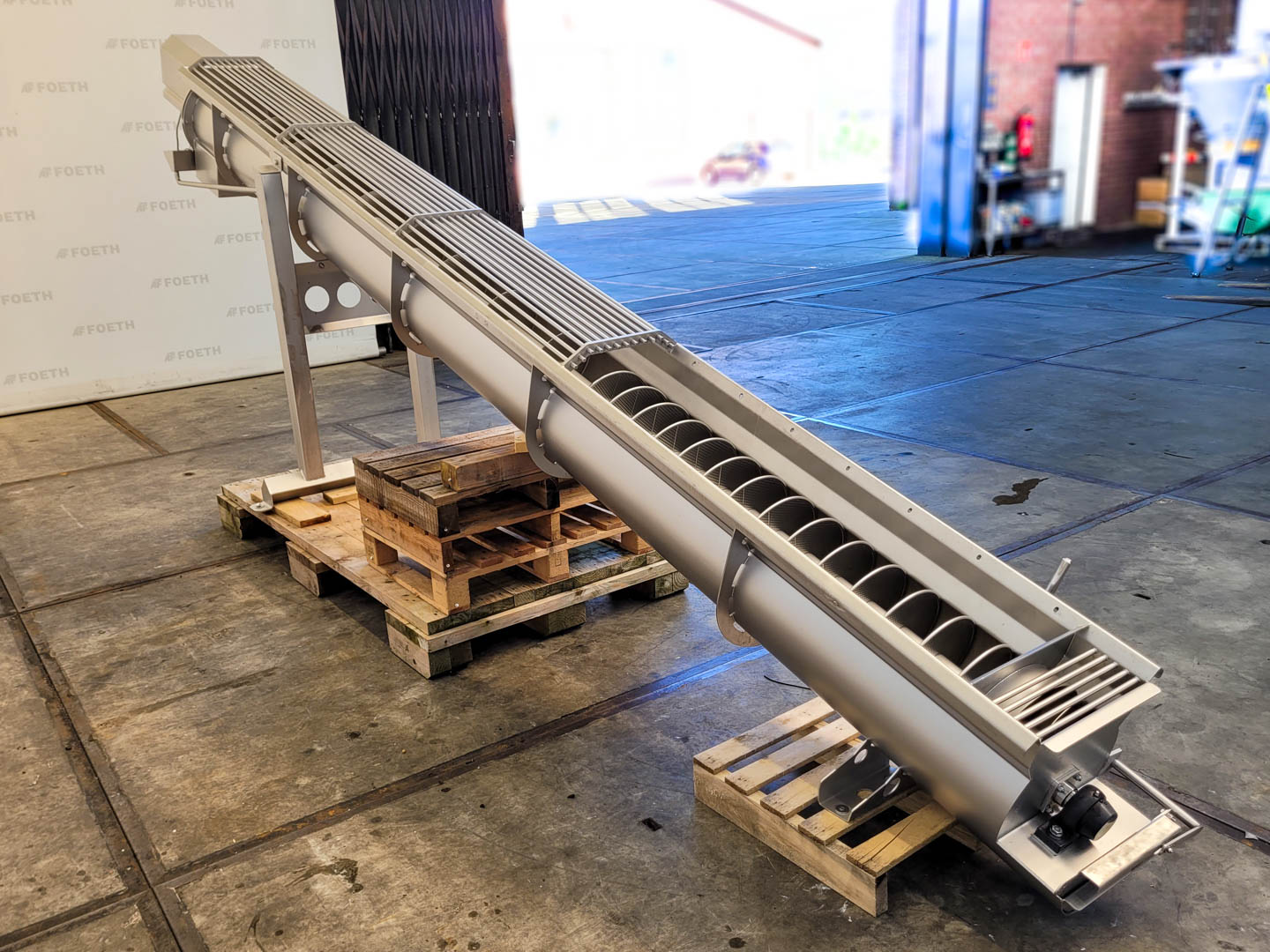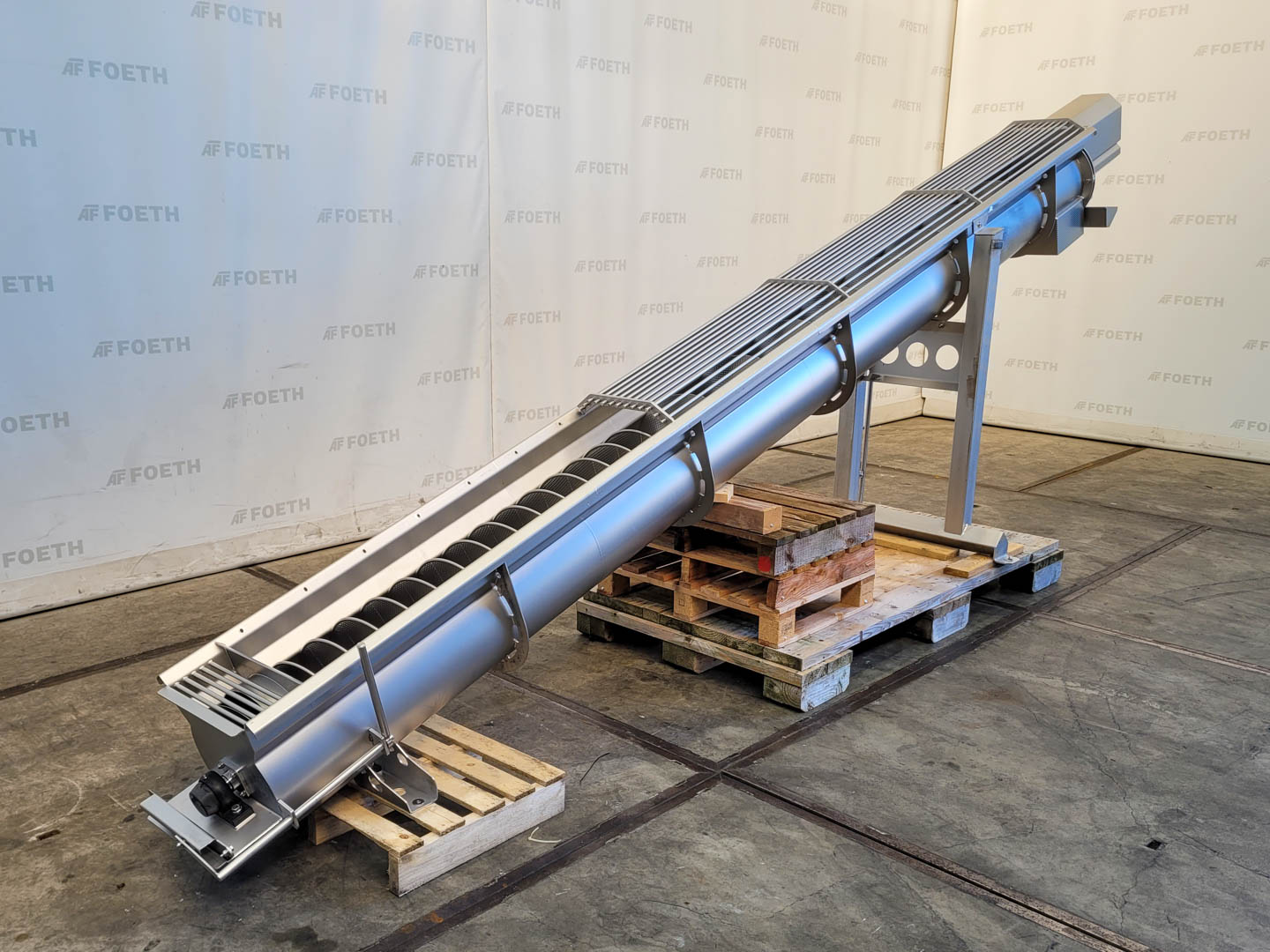 General SKU232U228 StandortBarneveld Haupteigenschaften Motor0.37 KW Länge4500 mm Spezifizierte Eigenschaften - Horizontale Förderschnecke MaterialEdelstahl 1.4301 (304) Horizontale Förderschneckecheck Mulden-Modelcheck Durchmesser350 mm Länge4500 mm Zwischen Einlauf und Auslauf4400 mm Wellendurchmesser130 mm Steigung93 - 300 mm Einlauf160x350 mm Auslauf350x280 mm Motor0,37 kW 220-240/380-415 Volt Schneckendrehzahl9,2 rpm Auslaufhoehe1430 mm Höhe zwischen Ein-und Auslauf1030 mm Information Herstellerunknown; missing type plate Platzbedarf5,2x1,1 m Totalhöhe1,9 m Gewicht550 kg Zusätzliche SpezifikationenKapazität: 4256 Ltr/h Was Sie von Maschinen von Foeth e ...