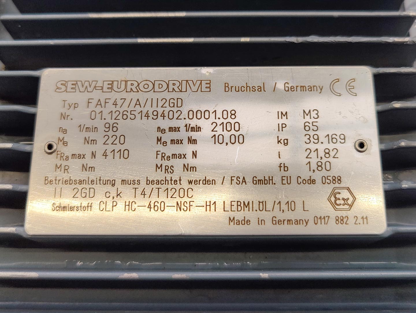 General SKU212T536 StandortBarneveld CEcheck HerstellerAmmag Haupteigenschaften Motor1.5 KW Länge1400 mm Einlass durchm.200 mm Spezifizierte Eigenschaften - Horizontale Förderschnecke MaterialEdelstahl 1.4301 (304), Edelstahl 1.4404 Horizontale Förderschneckecheck Durchmesser187 mm Länge1398,5 mm Wellendurchmesser106 mm Steigung103 mm EinlaufDia. 200 mm AuslaufDia. 200 mm Motor1,5 kW 220-240/380-415 Volt (Ex) Schneckendrehzahl96 rpm Auslaufhoehe388,9 mm Höhe zwischen Ein-und Auslauf1130,1 mm Information TypRDSCHN D187x1300x3,9° Masch.No.SR-1601 SG09 Baujahr2008 Platzbedarf1,1x0,5 m Totalhöhe0,65 m Gewicht230 kg ATEX konformecheck Was Sie von Maschinen von ...